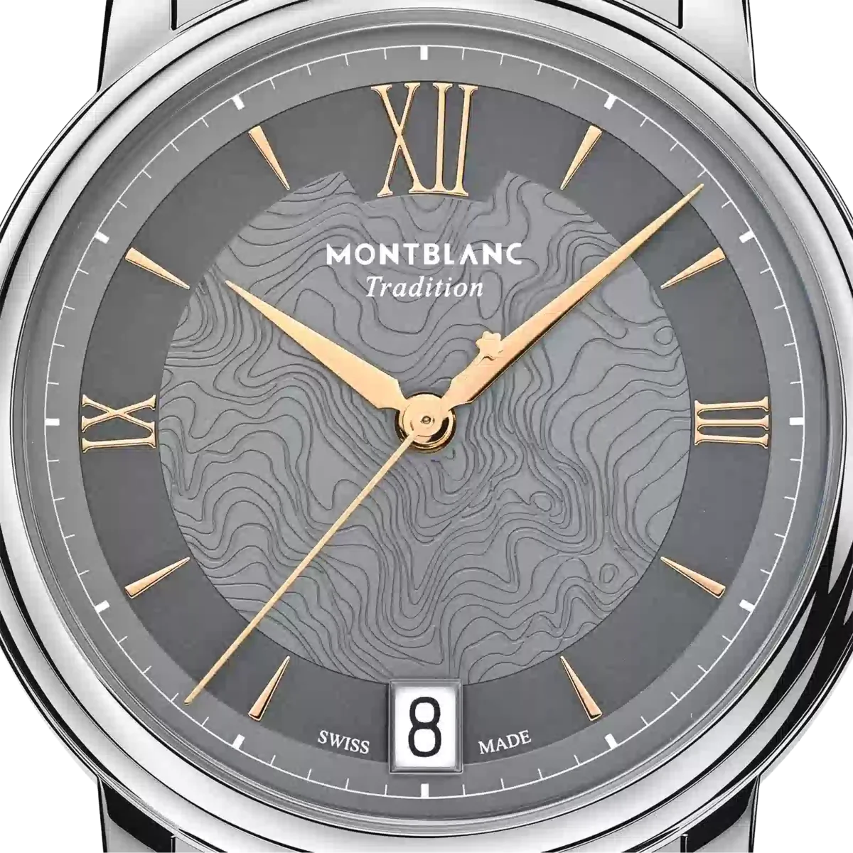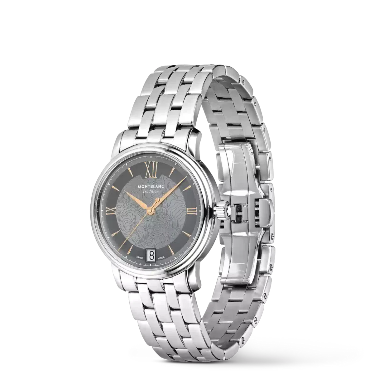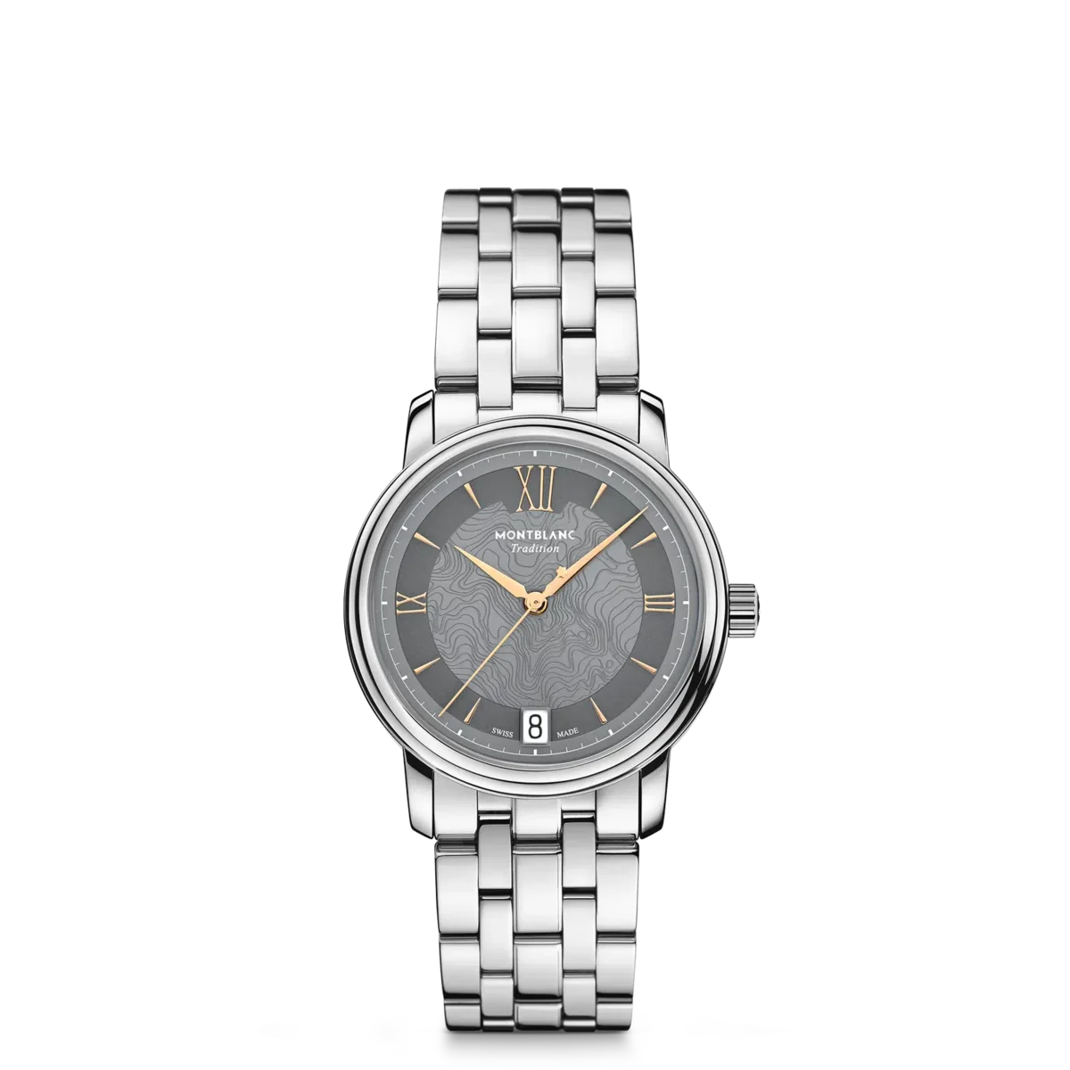 Montblanc Tradition Automatic Date are o carcasă din oțel inoxidabil de 32 mm cu corniere drepte și o lunetă dublă. Ceasul are un cadran gri care redă topografia Mont Blanc, cu cifre romane de culoare auriu roz și un „XII” roman proeminent. Acele orelor și minutelor în formă de sabie, acul secundelor și coroana cu emblema Montblanc, precum și brățara din oțel inoxidabil interschimbabilă completează aspectul său contemporan și elegant.