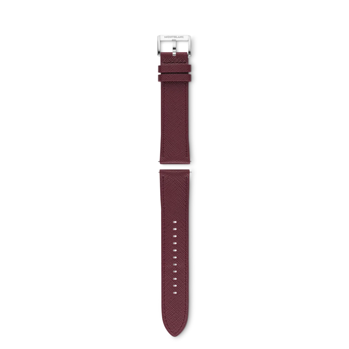 Curea din piele de vițel imprimată saffiano de 22 mm, de culoare burgund, cu cataramă reglabilă din oțel inoxidabil. Compatibilă cu toate ceasurile inteligente Montblanc Summit.