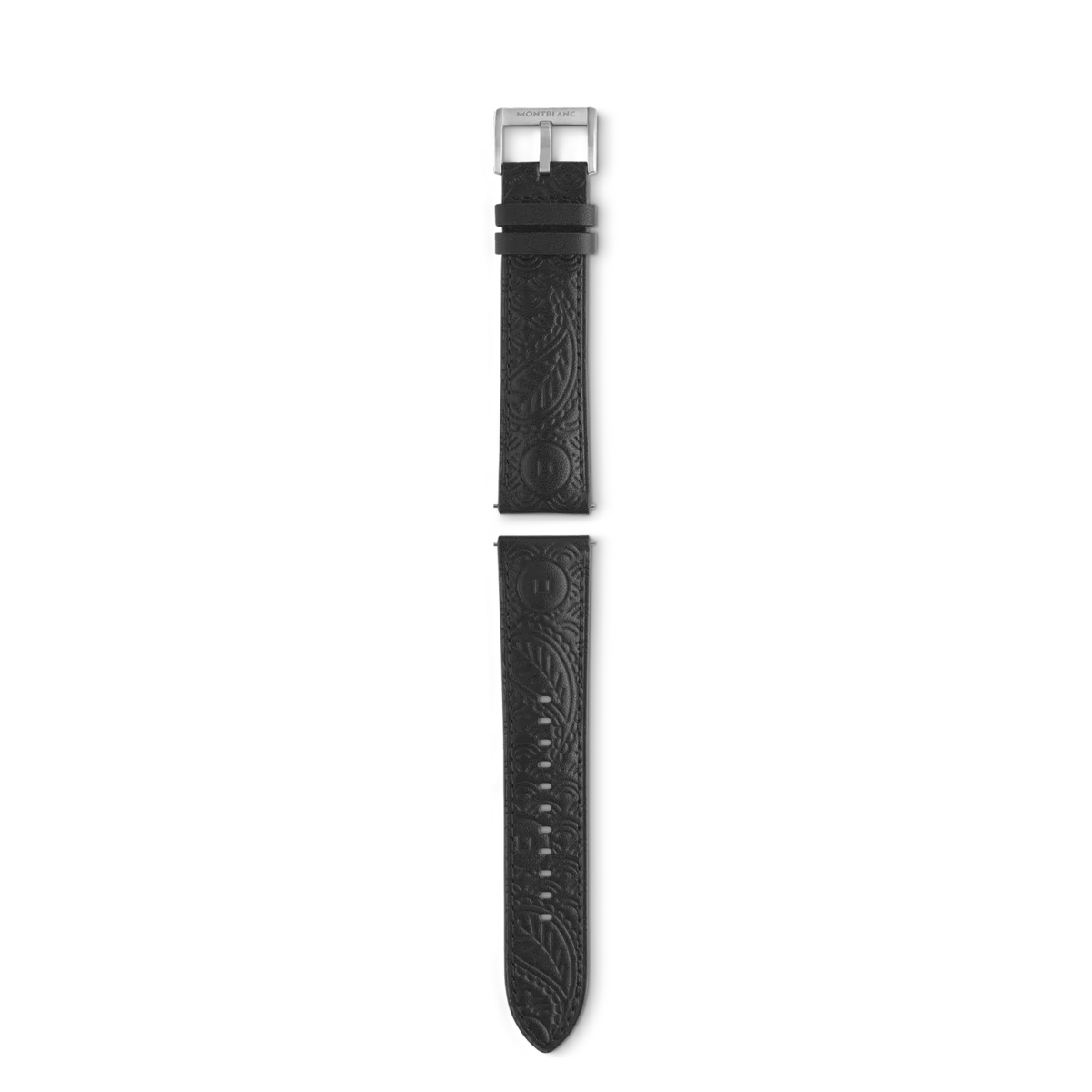 Curea din piele de vițel de 22 mm, cu un model în relief inspirat din romanul „În jurul lumii în 80 de zile” al lui Jules Verne. Acest model special este inspirat din aventura domnului Fogg și a lui Passepartout în călătoria lor de la Bombay la Yokohama și include simboluri indiene, chinezești și japoneze care aduc noroc. Catarama reglabilă din oțel inoxidabil. Compatibilă cu toate ceasurile inteligente Montblanc Summit.