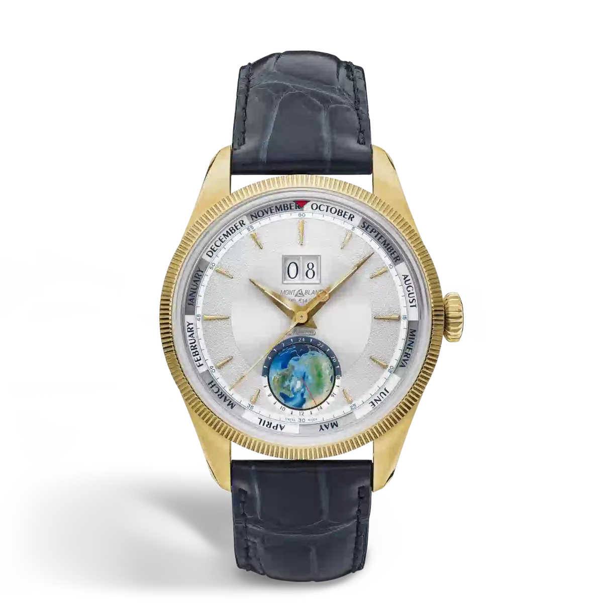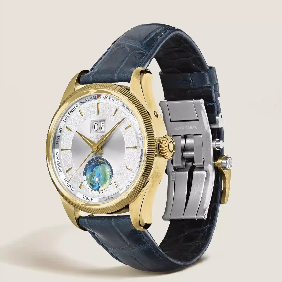 Montblanc 1858 Annual Calendar Geosphere Limited Edition este inspirat de codurile estetice ale moștenirii Minerva din anii 1950, cu cadranul său de culoare alb-argintiu, cu raze de soare și granulat, cu mâini și indici acoperiți cu aur galben. Carcasa de 42 mm din aur lime 750/1000 (18 karate) este prevăzută cu o lunetă canelată fixă, inspirată de ceasurile istorice Minerva. Ceasul este alimentat de un calibru MB M14.58 finisat manual, cu înfășurare manuală, dotat cu calendar anual, dată mare și funcție worldtimer. Pentru funcțiile calendarului anual, data mare este poziționată la ora 12 și are două ferestre mari poziționate una lângă alta, în timp ce lunile sunt afișate în jurul periferiei cadranului. Punctul focal vizual al acestui ceas este, fără îndoială, globul rotativ tridimensional, pictat manual, care prezintă emisfera nordică cu indicarea zilei și a nopții și o scală de 24 de ore. Ceasul este completat cu o curea albastră din piele de vițel interschimbabilă, cu imprimeu aligator, și o cataramă triplă pliabilă din aur lime 750/1000 (18 karate) și oțel inoxidabil, cu sistem de reglare fină.
