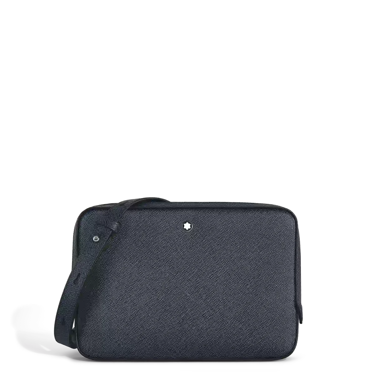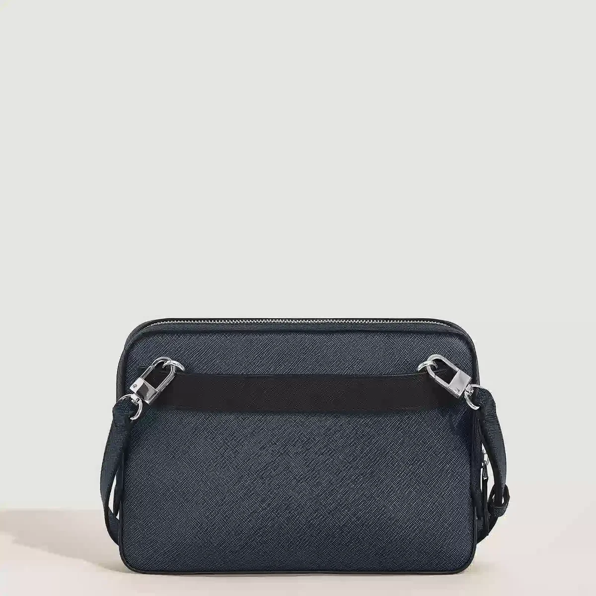 Inspirată din lumea scrisului, această mini geantă crossbody este confecționată din piele Sartorial embosată, într-o combinație rafinată de două nuanțe, albastru și negru. Concepută pentru versatilitate, poate fi purtată în mână sau pe umăr, folosind cureaua detașabilă și reglabilă. Pentru o funcționalitate sporită, este prevăzută cu o bandă din piele pe spate, care permite atașarea la genți mai mari.