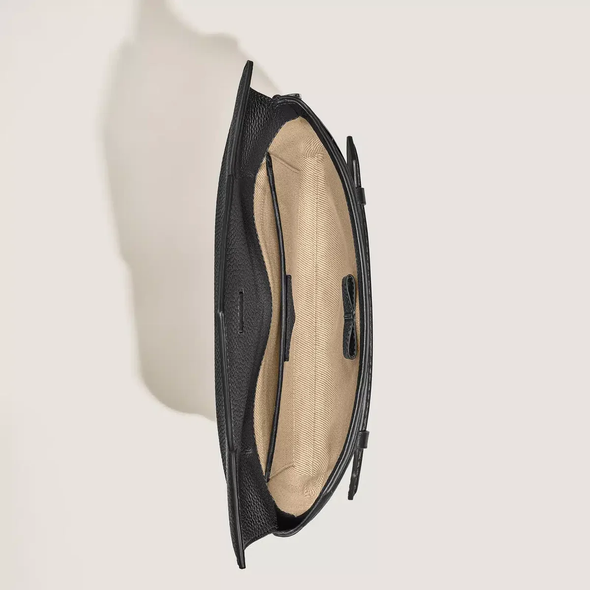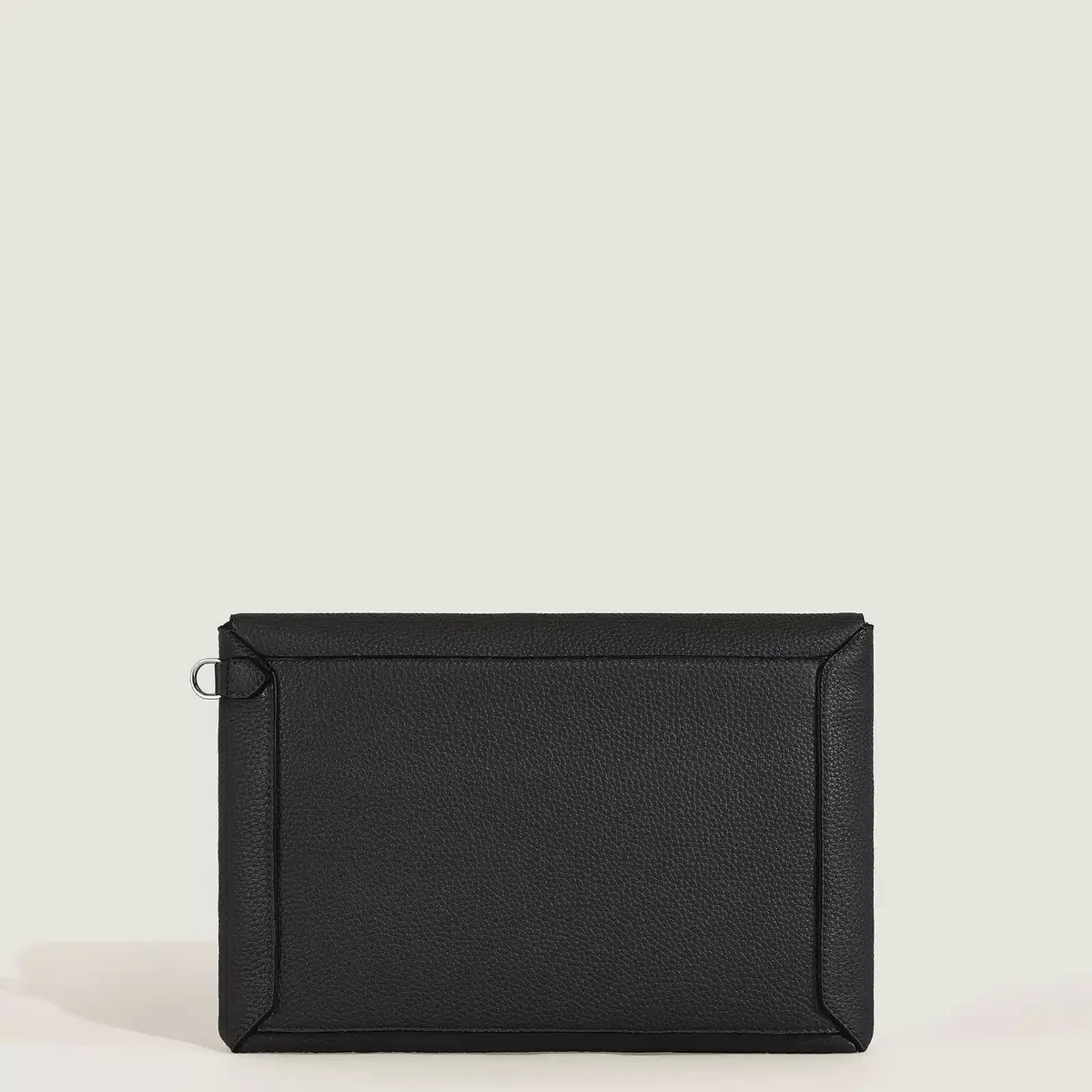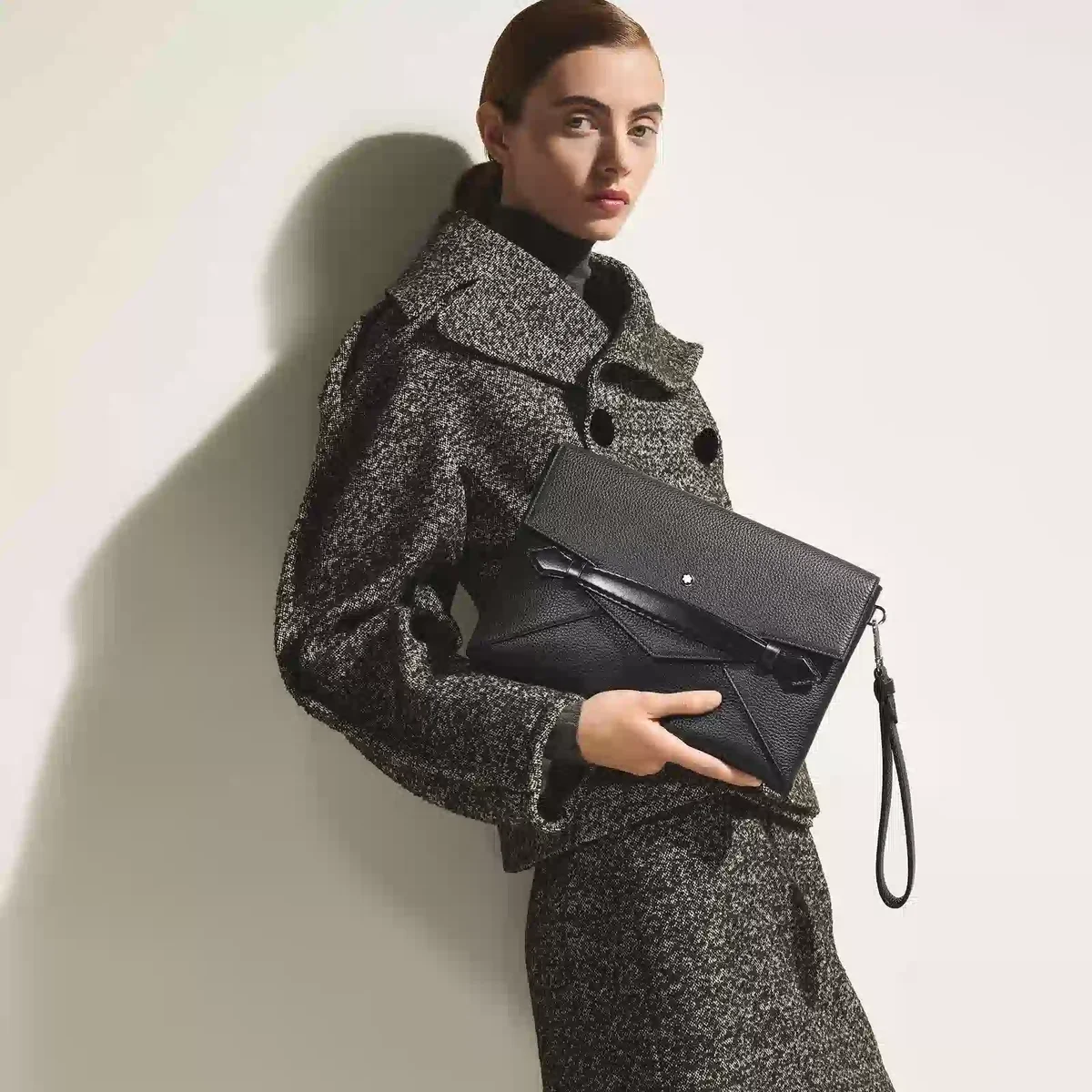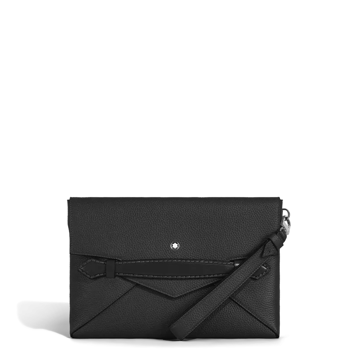 Această poșetă combină stilul Montblanc cu funcționalitatea rafinată. Designul său inspirat de plicuri este realizat din piele neagră suplă, cu cusături care imită mișcarea unui stilou care trasează o linie punctată. Mânerul frontal unic, în formă de peniță, oferă o modalitate confortabilă de a ține poșeta într-o singură mână, în timp ce mânerul detașabil pentru încheietura mâinii adaugă versatilitate. În interior, include un compartiment principal, un buzunar deschis și două bucle pentru instrumente de scris, completate de un buzunar posterior pentru un plus de practicitate.