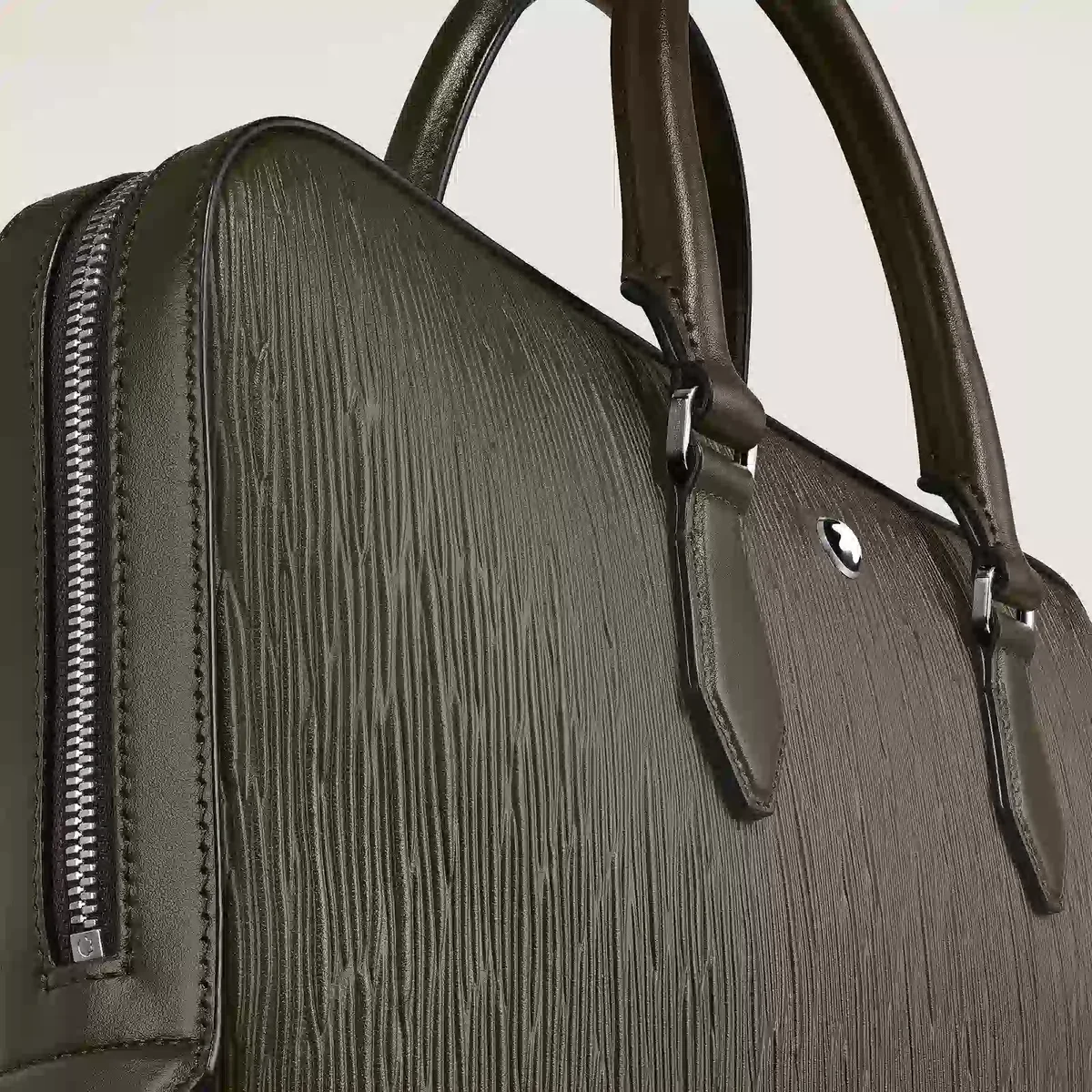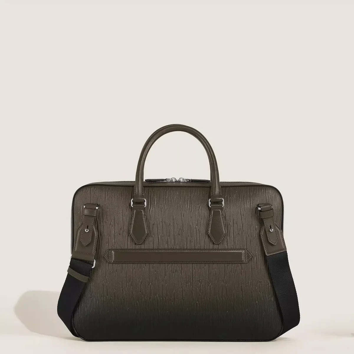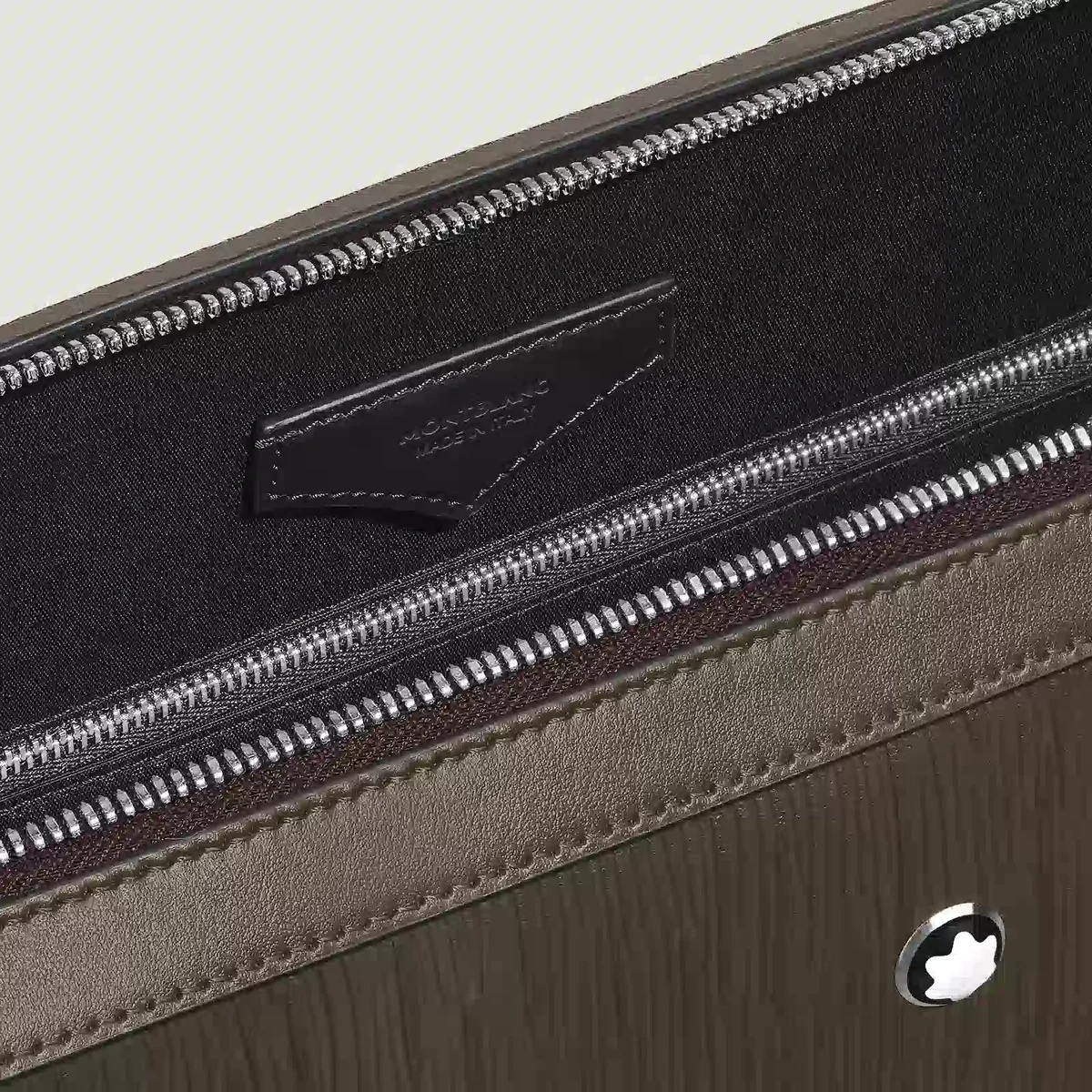 Această mapă subțire pentru documente, elegantă și spațioasă, celebrează tradiția Montblanc în domeniul scrierii, cu designul său inspirat de plicuri. Realizată din piele Corteccia de culoare kaki, motivul inspirat de scoarța de copac este obținut prin ștanțare la cald, iar efectul sfumato aplicat manual creează umbre pentru un finisaj rafinat și natural. Perfectă pentru obiectele esențiale de afaceri, aceasta poate acomoda dispozitive electronice și documente A4, în timp ce interiorul are două buzunare deschise și două bucle pentru instrumente de scris, combinând practicitatea cu stilul atemporal.