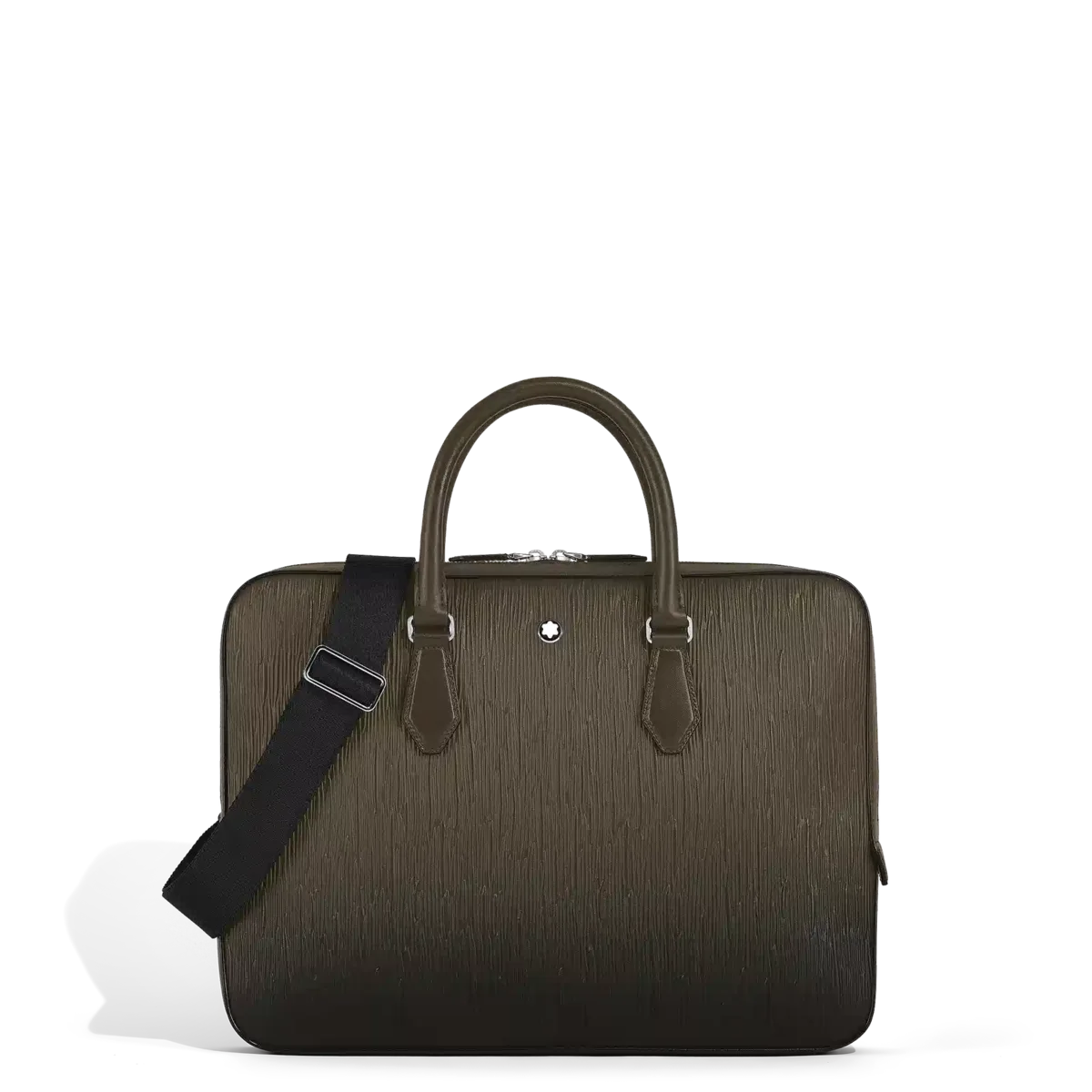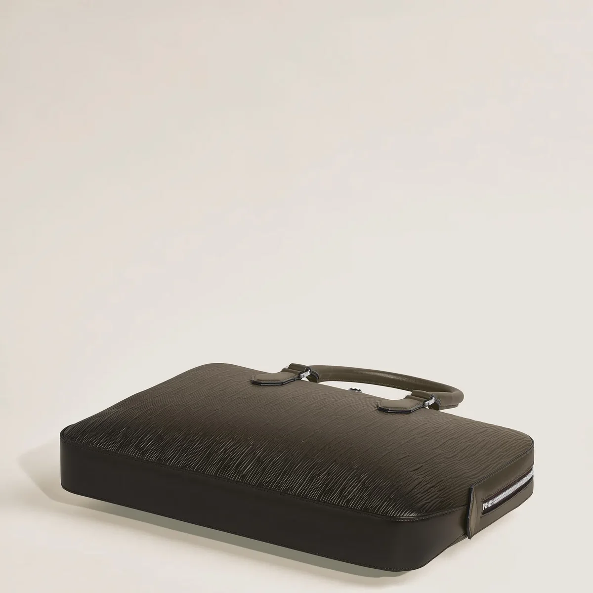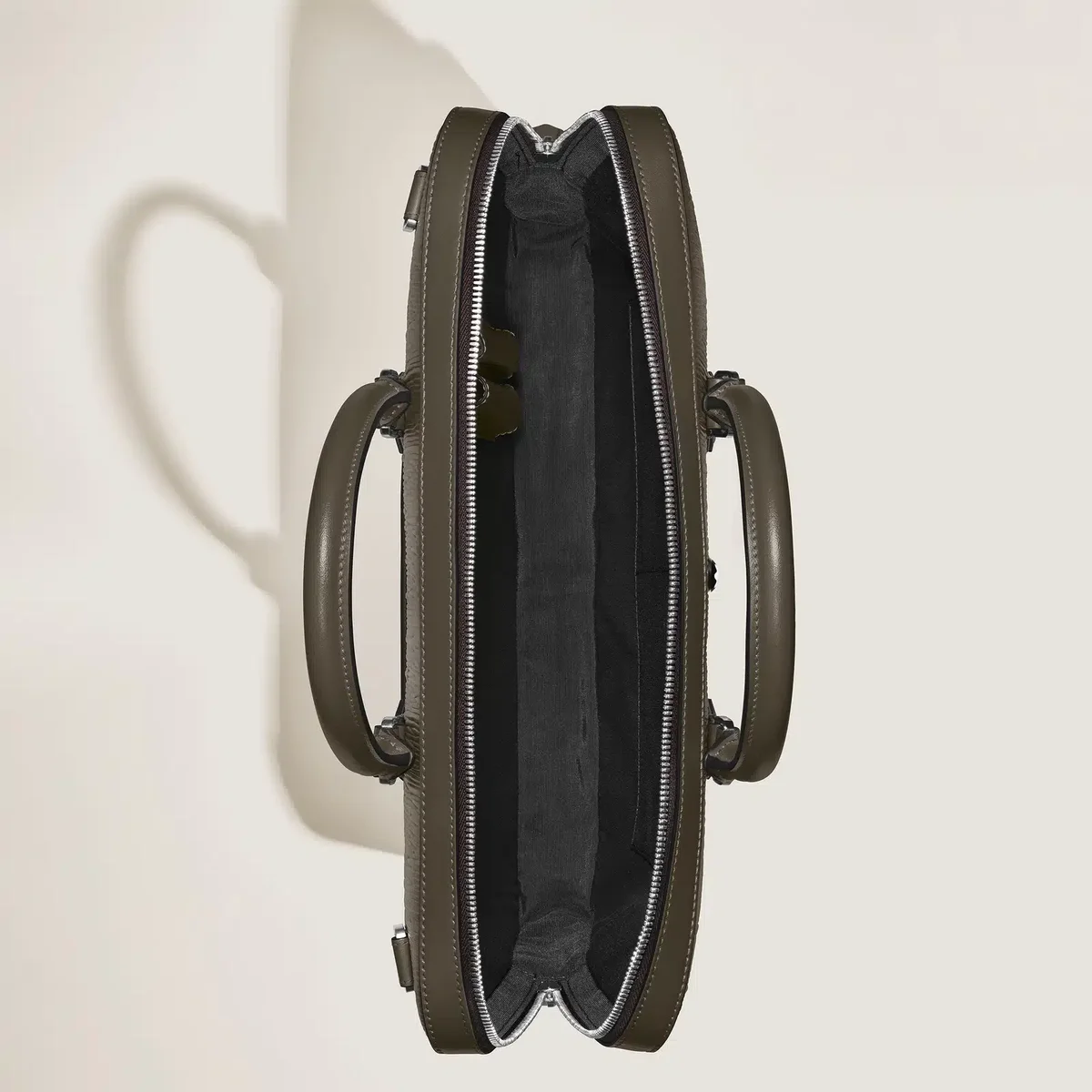 Această mapă subțire pentru documente, elegantă și spațioasă, celebrează tradiția Montblanc în domeniul scrierii, cu designul său inspirat de plicuri. Realizată din piele Corteccia de culoare kaki, motivul inspirat de scoarța de copac este obținut prin ștanțare la cald, iar efectul sfumato aplicat manual creează umbre pentru un finisaj rafinat și natural. Perfectă pentru obiectele esențiale de afaceri, aceasta poate acomoda dispozitive electronice și documente A4, în timp ce interiorul are două buzunare deschise și două bucle pentru instrumente de scris, combinând practicitatea cu stilul atemporal.