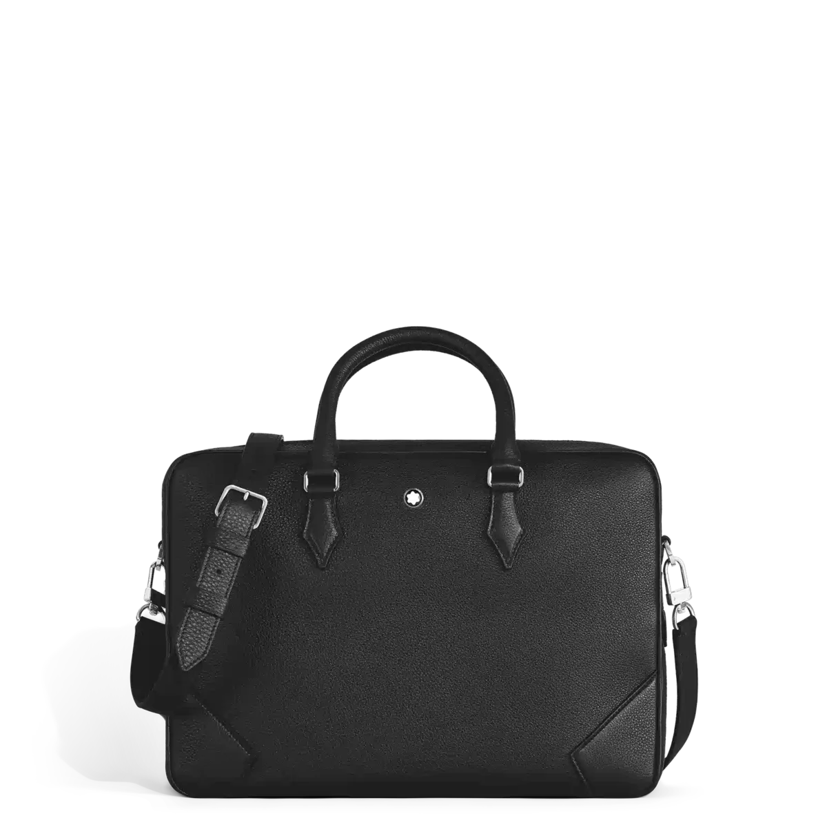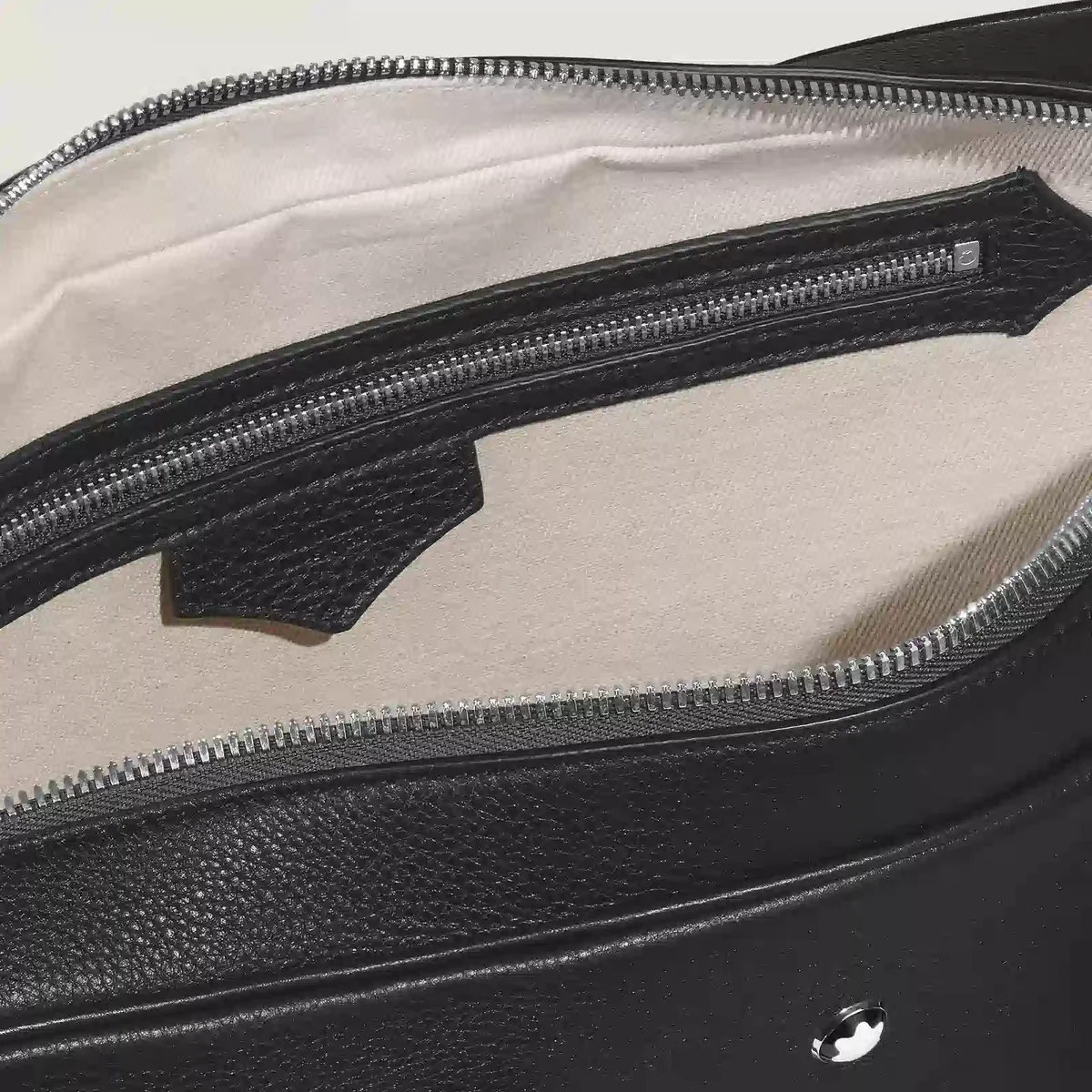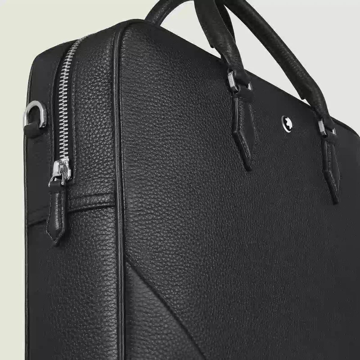 Această elegantă servietă pentru documente este confecționată din piele neagră moale și elegantă. Detaliile sale în formă de peniță, precum cusăturile, fermoarele și mânerele, sunt inspirate din cultura scrisului. O curea detașabilă și un sistem satelit permit diferite opțiuni de transport, în timp ce buzunarele interne facilitează organizarea în timpul călătoriilor de afaceri.
