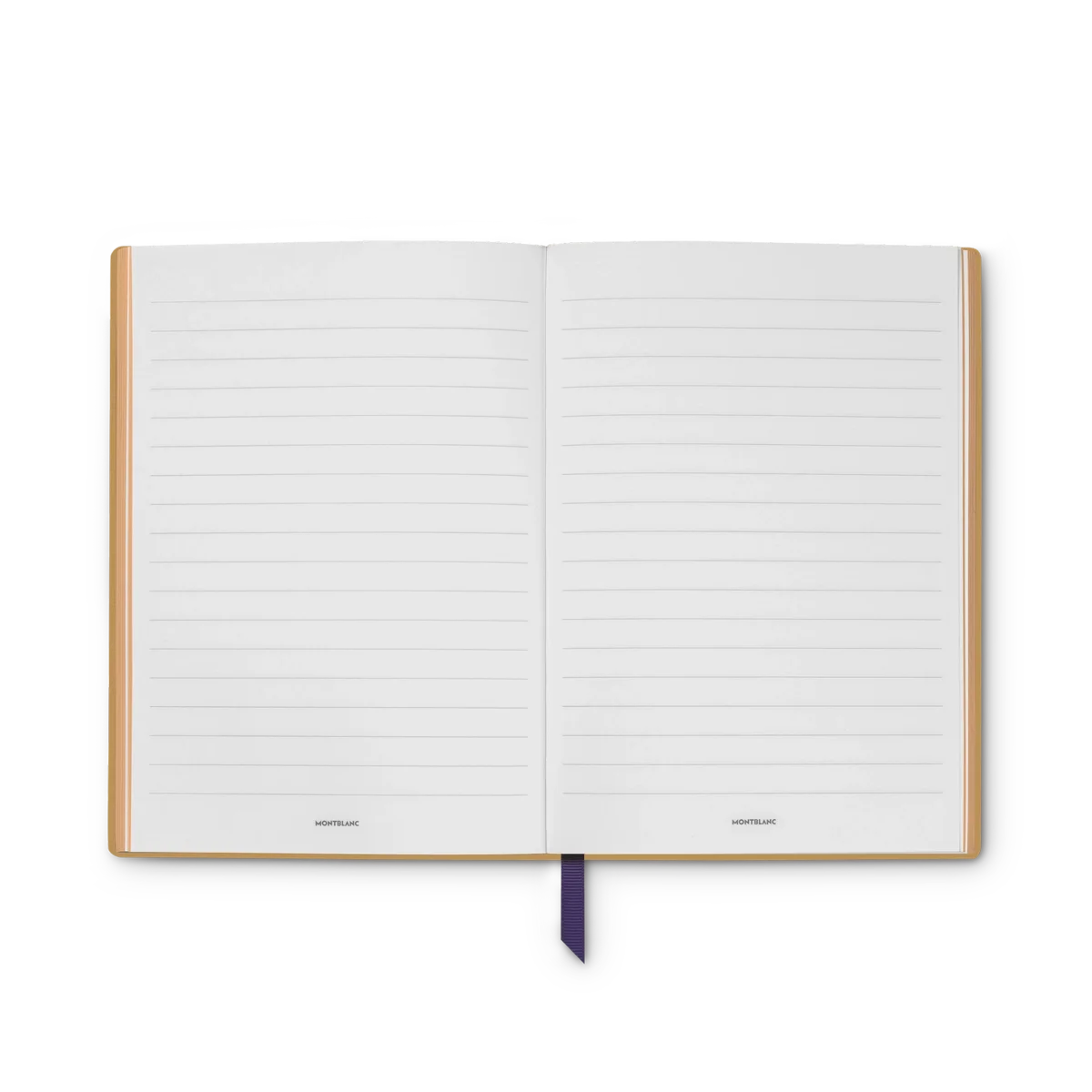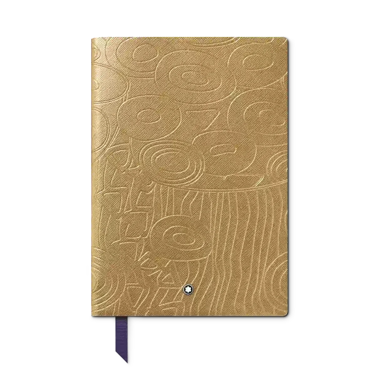 Caiet #146 mic, Masters of Art Homage to Gustav Klimt, culoare auriu – cu linii. Fabricat din piele cu imprimeu saffiano și un model în relief inspirat de arta lui Klimt. Fabricat în Italia. 96 de foi / 192 de pagini. Dimensiuni 150 x 210 mm.