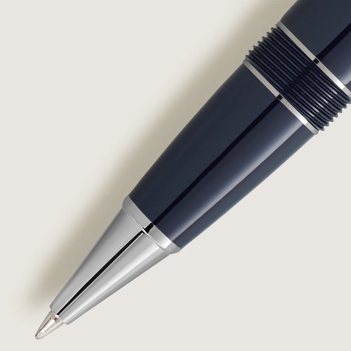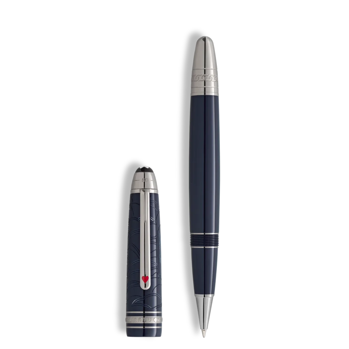 Colecția Meisterstück Around the World in 80 Days se inspiră din renumitul roman de aventuri al lui Jules Verne. Rollerball LeGrand, împodobit cu rășină prețioasă de culoare albastru închis, povestește călătoria epică a domnului Fogg și a lui Passepartout. Pornind în ultima etapă a călătoriei de la Yokohama înapoi la Londra, via Statele Unite, cei doi traversează vastul continent american cu trenul. Descoperă detaliile complexe – un tren gravat elegant cu laser pe capac, un model de lanț de siguranță pe con, care reflectă momentul crucial în care Passepartout detașează trenul de locomotivă pentru a salva echipajul atacat de Sioux.Designul șepcii surprinde supapele de presiune și fumul care se ridică din locomotivă, în timp ce clema are un simbol roșu lăcuit în formă de inimă, simbolizând uniunea dintre Phileas Fogg și prințesa Aouda. În plus, simbolurile reprezintă pariul îndrăzneț al lui Fogg de a finaliza călătoria în doar 80 de zile. Partea superioară a șepcii poartă gravată cronologia călătoriei – 36 de zile de la Yokohama la Londra, culminând cu un total de 80 de zile în jurul lumii.