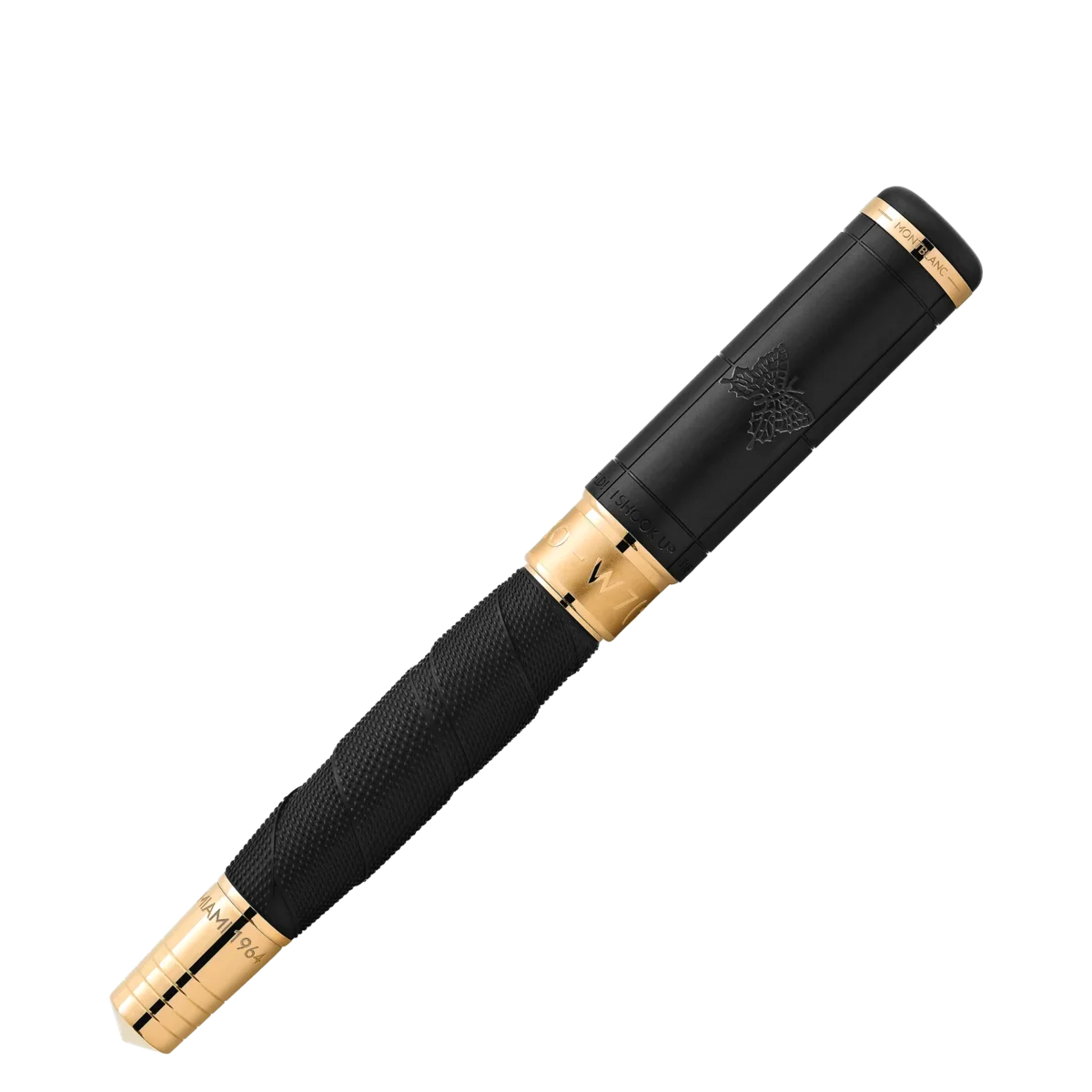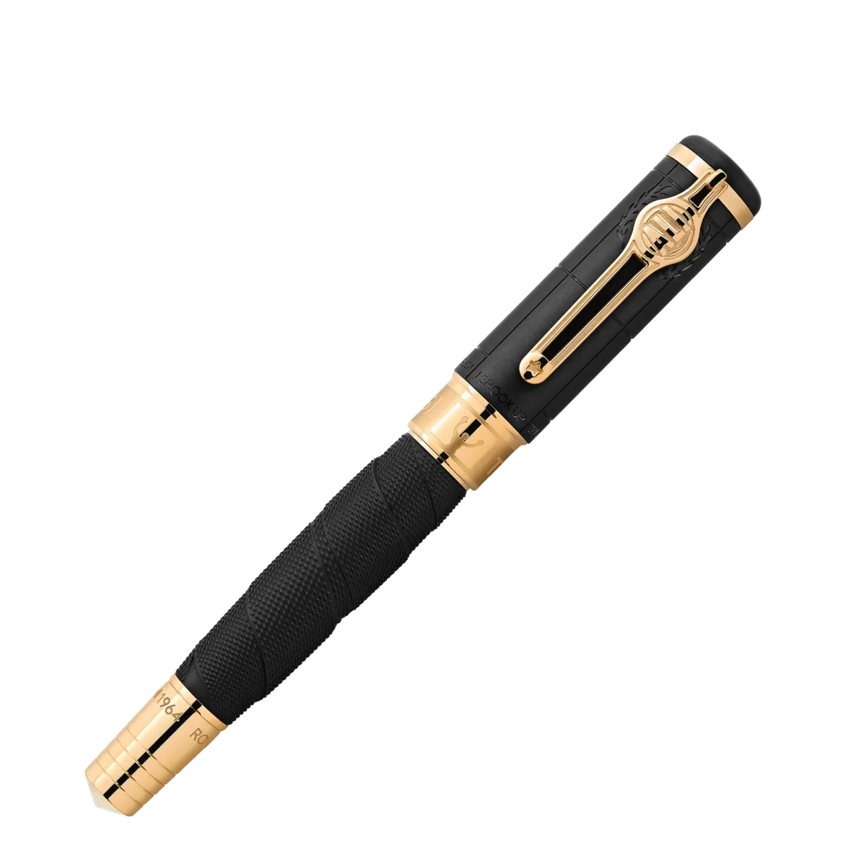 Puțini sportivi sunt celebrați și onorați ca triplul campion mondial la categoria grea, Muhammad Ali, ale cărui momente legendare în sport și activismul pentru drepturile civile l-au făcut unul dintre cei mai influenți sportivi și filantropi ai secolului XX. Ca sportiv, Ali a zguduit lumea cu forța, abilitatea și personalitatea sa, devenind campion mondial la categoria grea la doar 22 de ani. Cu toate acestea, cele mai mari rezultate ale sale au fost obținute datorită eforturilor sale umanitare. Realizat din rășină neagră prețioasă, capacul seamănă cu un sac de box, în timp ce corpul stiloului arată ca banda de box pe care sportivii o folosesc pentru a-și înfășura mâinile. Șapca prezintă diverse elemente de design, precum celebra exclamație a lui Ali și un fluture inspirat de stilul său tipic de luptă: „Plutește ca un fluture, înțeapă ca o albină”. Conul ascuțit preia această idee și are gravate patru linii care reprezintă corzile unui ring de box. Inscripțiile de pe con se referă la victoria lui Ali la Jocurile Olimpice din 1960 de la Roma și la primul său titlu mondial la categoria grea, câștigat la Miami în 1964. Detaliile victoriei sale, și anume câștigarea în runda a șaptea prin knock-out tehnic, se regăsesc pe inelul capacului. Pentru a sărbători primul său titlu, emblema Montblanc din rășină albă este decorată cu un „1”. Pentru a sublinia acest succes, clema are forma unei centuri de campionat de box și poartă numele său.