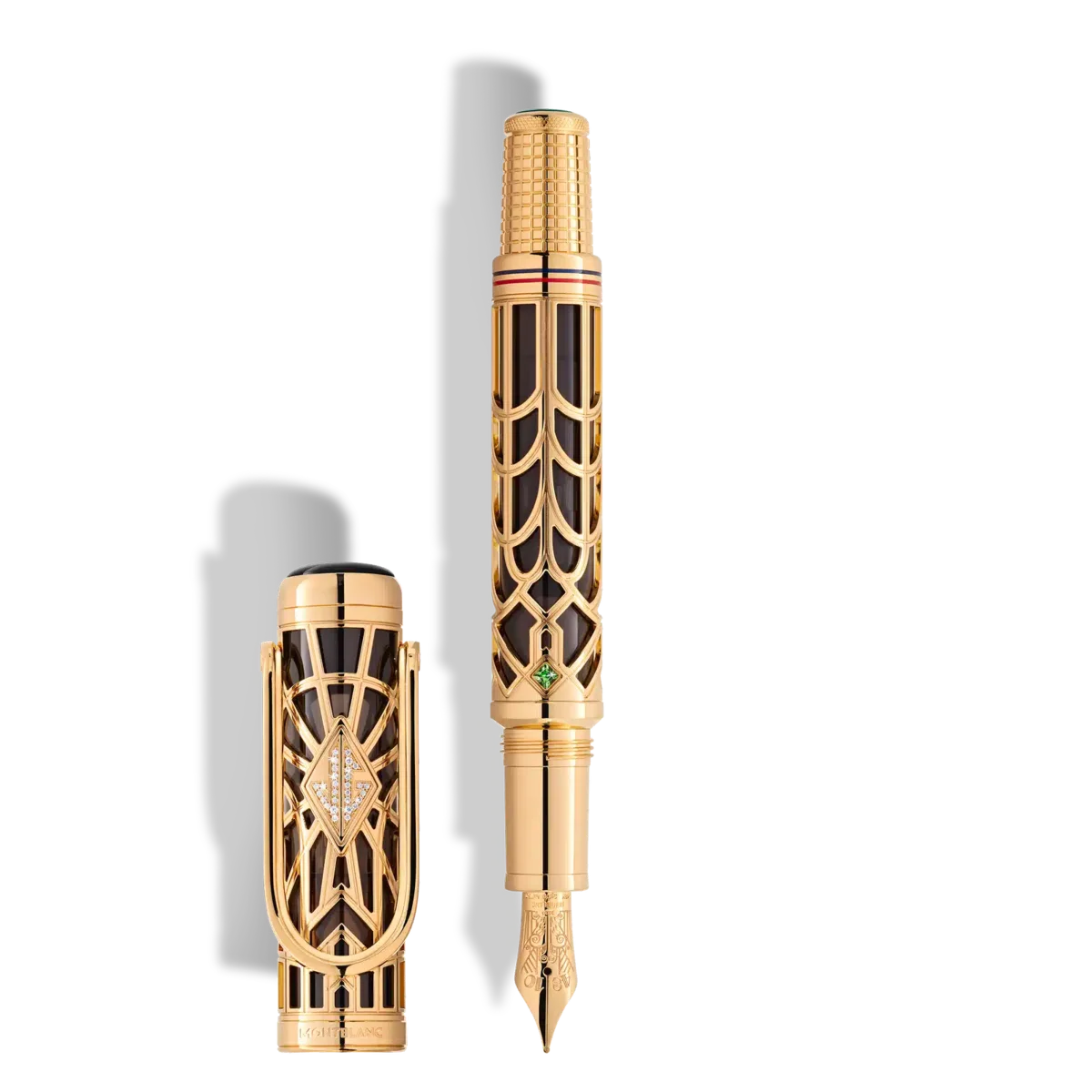 Anumite romane rămân în istoria literară și, în același timp, ajung să simbolizeze o întreagă epocă. „Marele Gatsby” al lui F. Scott Fitzgerald este una dintre aceste bijuterii ale literaturii americane moderne. Publicat în 1925, romanul zugrăvește o imagine fascinantă a epocii jazzului și a anilor ’20, o perioadă de prosperitate și auto-îngăduință fără precedent. Orașul New York pulsând de viață, vilele opulente din Long Island și petrecerile strălucitoare ale înaltei societăți constituie fundalul poveștii lui Jay Gatsby, un milionar misterios, care nu se va da în lături de la nimic pentru a recâștiga afecțiunea iubirii pierdute din tinerețe, Daisy Buchanan. Montblanc onorează această capodoperă literară ecranizată de numeroase ori, sinonimă cu lumea glamour a Art Deco, cu ediția limitată Great Characters Homage to The Great Gatsby 100. Art Deco a conferit un strălucire glamour tuturor lucrurilor. Arhitectura a ieșit literalmente din bidimensionalitate și s-a înălțat spre cer, simbolizând progresul și emanciparea. Arcadele, treptele, unghiurile și liniile zimțate decorative conferă clădirilor o dinamică și o estetică inconfundabile – și, evident, au inspirat și această ediție limitată. Arcadele și liniile simetrice scheletate, realizate din aur galben solid Au 750, dezvăluie suprafața neagră, translucidă de dedesubt. Tsavoritele verzi strălucitoare de pe capac și corp fac referire la lumina verde de pe docul casei lui Daisy, simbol al speranței pentru milionarul îndrăgostit Jay Gatsby, mai cunoscut sub numele de Marele Gatsby. Imaginile produsului pot diferi de produsul real. Jay Gatsby este întruchiparea unui ideal universal, omul american care s-a realizat singur. Cu toate acestea, în spatele fațadei bogate a lui Gatsby, visul începe să se destrame. Bogăția lui provine din comerțul cu alcool în perioada prohibiției, când lichidul interzis era adesea umplut în sticle mici, cu capac cu filet, ușor de ascuns. Fiecare picătură era prețioasă. În consecință, nu numai conținutul, ci și designul flacoanelor de buzunar era venerat. Pentru ediția limitată Great Characters Homage to The Great Gatsby 100, conul imită capacul cu filet gravat al unui flacon Art Deco. Mitul visului american este evocat de inelele fine în culorile steagului american care împodobesc conul. La fel ca stratul exterior, accesoriile ediției sunt realizate din aur galben masiv Au 750, deoarece aurul este simbolul bogăției, puterii și statutului social, iar culoarea galbenă este cea mai frecvent menționată în roman. În contrast, capacul și corpul negru intens, translucid, reprezintă corupția și decăderea morală care se ascund sub fațada strălucitoare a societății bogate. Lumina verde strălucitoare care luminează în fiecare seară docul de la casa lui Daisy este singura rază de speranță și este reprezentată aici, alături de tsavoritul de pe capacul și corpul scheletat, printr-o incrustare de malachit verde în con. Aceasta simbolizează dorința unui viitor mai bun și dorința lui Gatsby de a o recâștiga pe Daisy. Cu toate acestea, iubirea lui rămâne neîmpărtășită – de neatins, în ciuda întregii sale bogății. Puterea amețitoare, dar aparent iluzorie a banilor este simbolizată de clema placată cu aur în formă de clemă pentru bani. Deschiderea sa rotunjită este decorată cu inițialele lui Jay Gatsby încrustate cu diamante, sub forma unui monogram romboidal Art Deco. Emblema Montblanc din vârf este realizată din sidef înconjurat de onix negru, o combinație de materiale care a inspirat unele dintre cele mai elegante creații ale designerilor de bijuterii din perioada Art Deco. Eleganța liniilor sale este motivul cheie al Art Deco, izbitoare și sofisticată în același timp.O gravură pur liniară împodobește și penița solidă din aur Au 750 realizată manual. Cifra 100 este semnificativă în mai multe moduri. Ea indică numărul limitat de piese din ediția limitată Great Characters Homage to The Great Gatsby 100, făcând aluzie la cea de-a 100-a aniversare a personajului fictiv – adică la cea de-a 100-a aniversare a publicării romanului. În plus, indică lumea banilor și cea mai mare bancnotă de dolar în circulație la momentul respectiv.