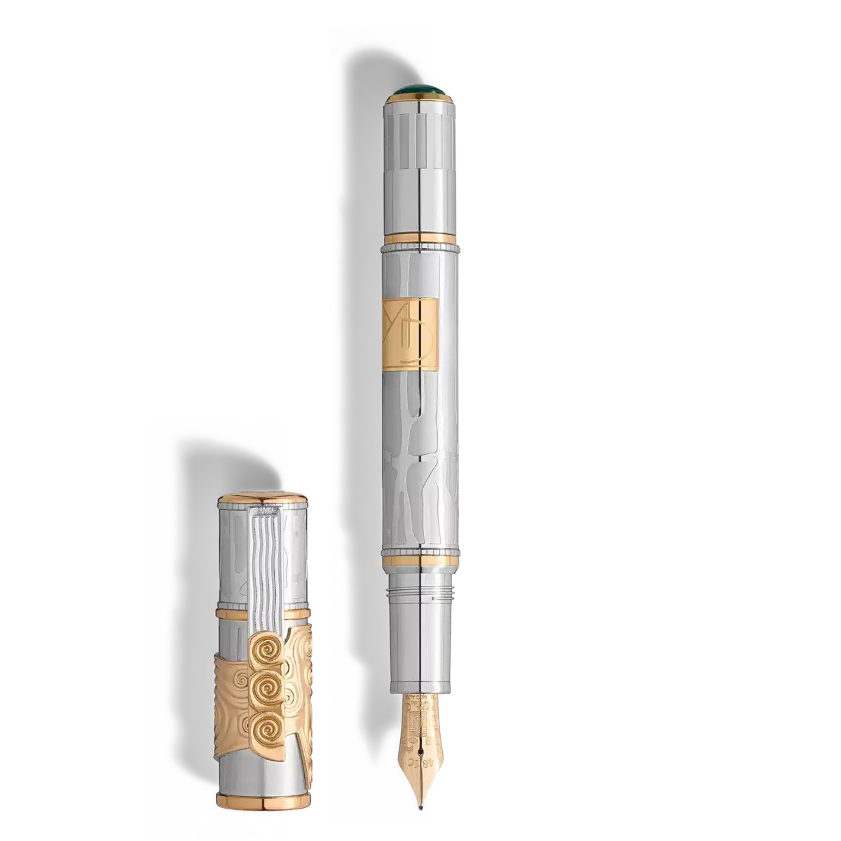 De-a lungul istoriei, marii artiști au exprimat experiența umană într-un limbaj universal al formei și frumuseții. Colecția Montblanc Masters of Art onorează contribuția lor eternă la căutarea perfecțiunii în artă – o căutare pe care Montblanc o celebrează și la care participă. Un artist a cărui viziune a contribuit la formarea Art Nouveau-ului vienez și a Epocii de Aur este Gustav Klimt. Montblanc Masters of Art Homage to Gustav Klimt Limited Edition 888 celebrează angajamentul său activ față de Secesiunea vieneză și prezintă elemente de design din Beethoven Frieze – capodopera de mari dimensiuni din „Faza de Aur” pe care a creat-o pentru clădirea Secesiunii. Acoperirea solidă din aur galben Au 750 în relief pe capacul acoperit cu platină, cu spirale și linii verticale care simbolizează corzile unei lire, este o referință la ornamentele aurii ale Beethoven Frieze, precum și la figura poetică care cântă la liră, ale cărei sunete se spune că potolesc dorința omenirii de fericire. Liniile bidimensionale inspirate de reliefurile fațadei clădirii Secession strălucesc pe fundalul mat al capacului și corpului acoperite cu platină. Combinația de aur galben solid Au 750 și elemente acoperite cu platină pe capac și corp reflectă materialele experimentale și luxoase tipice lui Gustav Klimt. Interacțiunea este îmbogățită de un cabochon de malachit în con. Culoarea verde a malachitului evocă primăvara, anotimpul noilor începuturi. În semn de recunoaștere a realizărilor lui Klimt pentru Secesiunea vieneză, incrustarea din aur masiv Au 750 de pe corp poartă monograma Secesiunii cu inițialele GK. Clipul ediției limitate 888 Homage to Gustav Klimt este special conceput cu referire la Pallas Athene a lui Gustav Klimt. Deoarece Athena este zeița războiului și a artelor, ea este reprezentată lansând lupta pentru libertatea artistică. Liniile ușor curbate care se termină în trei spirale pe clipul parțial acoperit cu platină și parțial acoperit cu aur galben al ediției limitate 888 corespund decorațiunii de pe rama metalică forjată. Penita din aur galben solid Au 750 realizată manual a ediției limitate Homage to Gustav Klimt 888 este împodobită cu elemente grafice fin gravate care formează modelele geometrice tipice întâlnite în multe dintre lucrările lui Gustav Klimt.