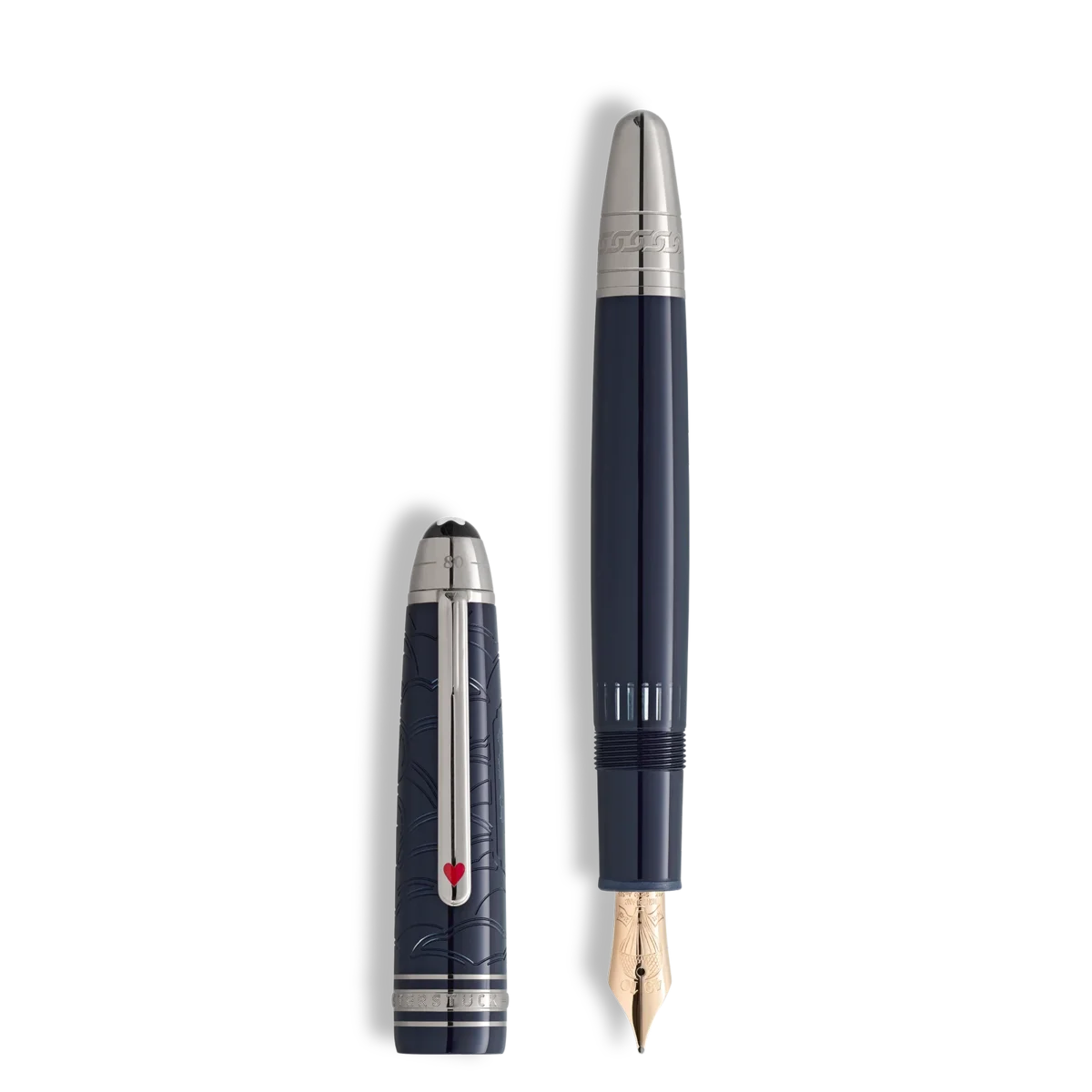 Colecția Meisterstück Around the World in 80 Days se inspiră din renumitul roman de aventuri al lui Jules Verne. Stiloul LeGrand, decorat cu rășină prețioasă de culoare albastru închis, povestește călătoria epică a domnului Fogg și a lui Passepartout. Pornind în ultima etapă a călătoriei de la Yokohama înapoi la Londra, via Statele Unite, cei doi traversează vastul continent american cu trenul. Descoperă detaliile complexe – un tren gravat elegant cu laser pe capac, un model de lanț de siguranță pe con, care reflectă momentul crucial în care Passepartout detașează trenul de locomotivă pentru a salva echipajul atacat de Sioux.Designul șepcii surprinde supapele de presiune și fumul care se ridică din locomotivă, în timp ce clema are un simbol roșu lăcuit în formă de inimă, simbolizând uniunea dintre Phileas Fogg și prințesa Aouda. În plus, simbolurile reprezintă pariul îndrăzneț al lui Fogg de a finaliza călătoria în doar 80 de zile. Partea superioară a capacului poartă gravată cronologia călătoriei – 36 de zile de la Yokohama la Londra, culminând cu un total de 80 de zile în jurul lumii.Acest instrument de scris este înnobilat de un peniț din aur de 14K realizat manual, marcat cu 14/11 și 21/12 – o amintire a plecării domnului Fogg din Yokohama pe 14 noiembrie și a planului său ambițios de a se întoarce la clubul din Londra până pe 21 decembrie pentru a câștiga pariul. De asemenea, este decorat cu o reprezentare a unui balon cu aer cald, referință la primul roman de aventuri al lui Jules Verne.