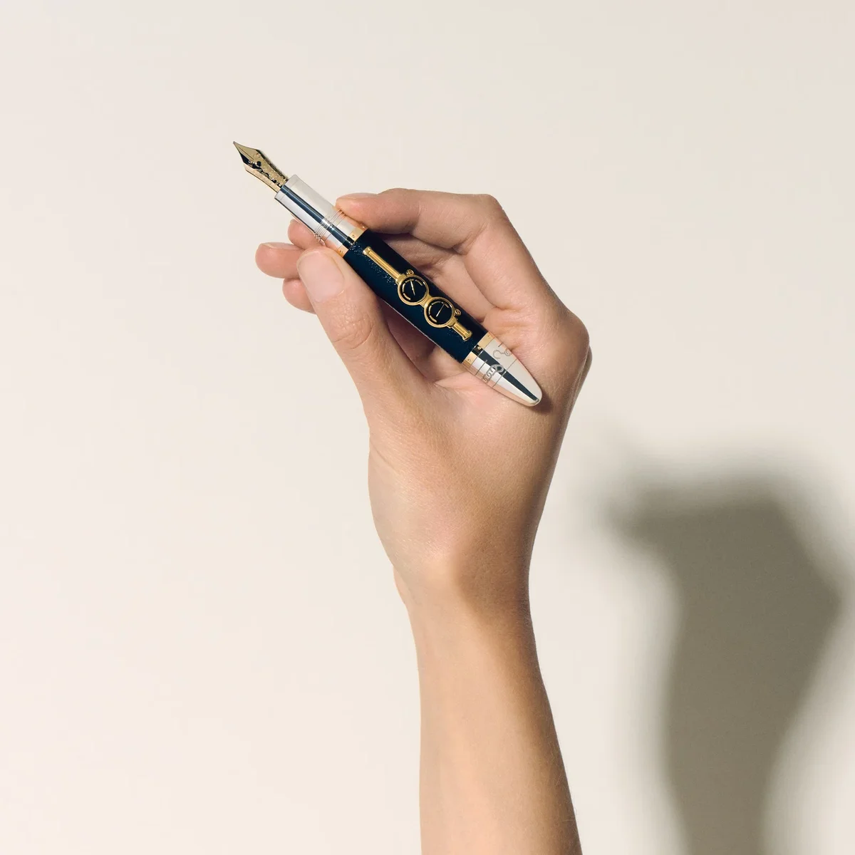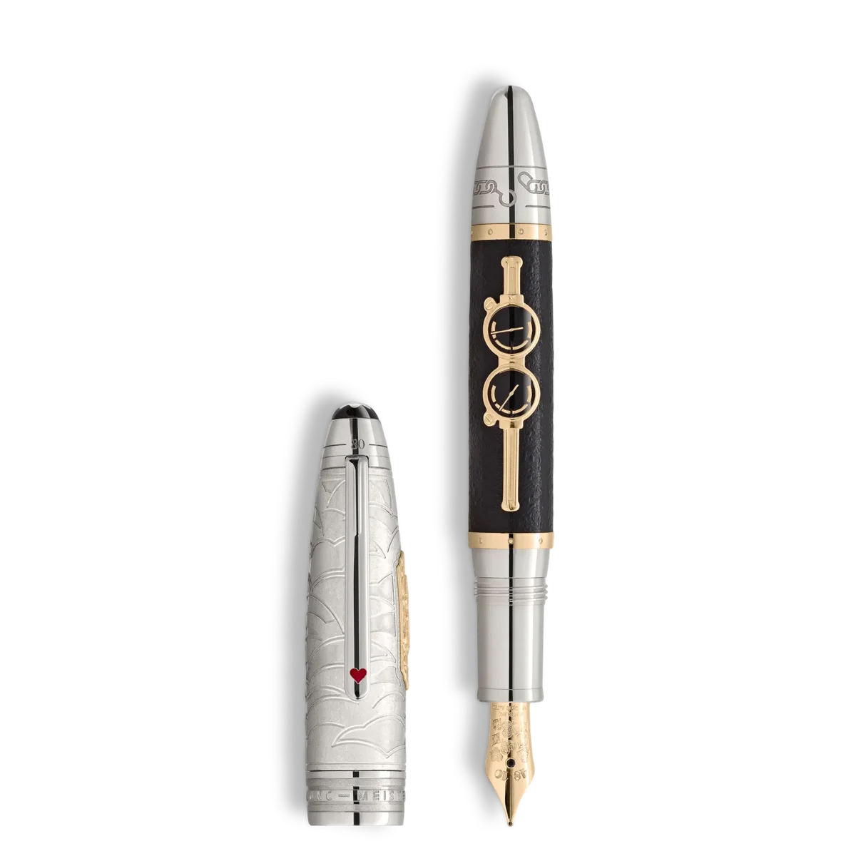 Colecția Meisterstück Around the World in 80 Days se inspiră din renumitul roman de aventuri al lui Jules Verne. Stiloul cu rezervor Limited Edition 811 din argint sterling Ag 925 și lac structurat povestește călătoria epică a domnului Fogg și a lui Passepartout. Pornind în ultima etapă a călătoriei de la Yokohama înapoi la Londra, via Statele Unite, cei doi traversează vastul continent american cu trenul, ceea ce este reprezentat pe cartușul din aur masiv Au750 / 18k încrustat pe capacul din argint sterling Ag925. Designul capacului surprinde fumul care se ridică din locomotivă, în timp ce o incrustare 3D reprezentând supapele de presiune împodobește corpul texturat. Clipul are o inimă roșie lăcuită, simbolizând uniunea dintre Phileas Fogg și prințesa Aouda. În plus, cărțile de joc reprezintă pariul îndrăzneț al lui Fogg de a finaliza călătoria în doar 80 de zile. Capacul are gravată cronologia călătoriei – 36 de zile de la Yokohama la Londra, culminând cu un total de 80 de zile în jurul lumii. Pe con se află un model de lanț de siguranță, care reflectă un moment crucial în care Passepartout detașează trenul de locomotivă pentru a salva echipajul atacat de Sioux. Instrumentul de scris este finisat cu un peniț din aur de 18K realizat manual, decorat cu un spinel negru de 1,5 mm și un model de cărți de joc.