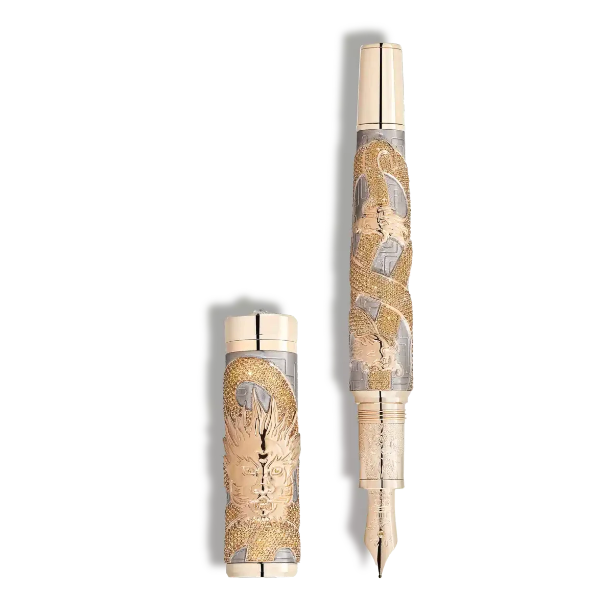 Montblanc dedică o ediție limitată foarte specială câtorva dragoni care au devenit unii dintre cei mai venerați din cultura est-asiatică. Al unsprezecelea din serie îl prezintă pe Coiling Dragon Dragon. Majestuosul Coiling Dragon își încolăcește sinuos corpul în jurul capacului și corpului din aur alb solid Au 750, ca o gravură manuală realizată cu îndemânare și răbdare. Reflectând filosofia tradițională chineză, în care galbenul simbolizează elementul pământ, iar dragonul este asociat cu pământul datorită controlului său asupra vremii și naturii, corpul este complet încrustat cu safire galbene atent selecționate. Pentru a se potrivi cu culoarea corpului dragonului, ochii și conul acestuia sunt încrustați cu safire galbene, în timp ce capul și ghearele dragonului sunt realizate din aur masiv Au 750. Un model gravat manual, simbolizând un nod chinezesc pentru a aduce noroc, îmbogățește corpul ediției. Penița solidă din aur 750, realizată manual, acoperită cu aur și încrustată cu un safir galben deschis, poartă o gravură delicată a unui pavilion chinezesc înconjurat de apă, în onoarea fenomenului mitic Shen (蜃, care înseamnă Miraj), un tip special de dragon. Aceste structuri servesc ca locuri de liniște și meditație. Designul este îmbogățit și mai mult cu o gravură a capului dragonului pe partea frontală din aur masiv Au 750, în timp ce vârful capacului este încununat de diamantul Montblanc, înconjurat de diamante tăiate în stil briliant.