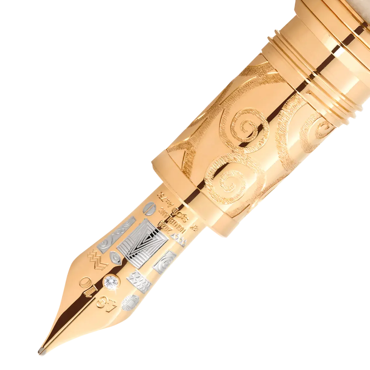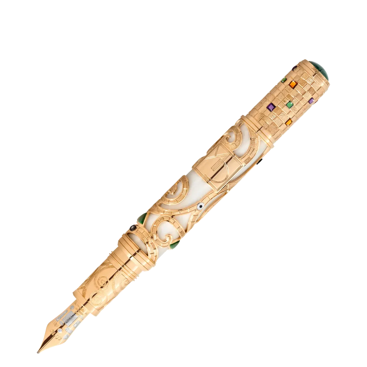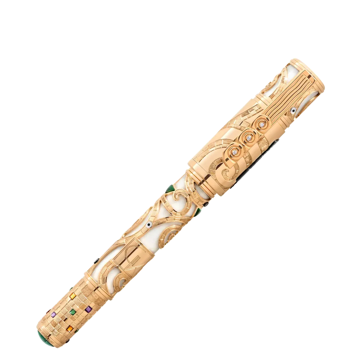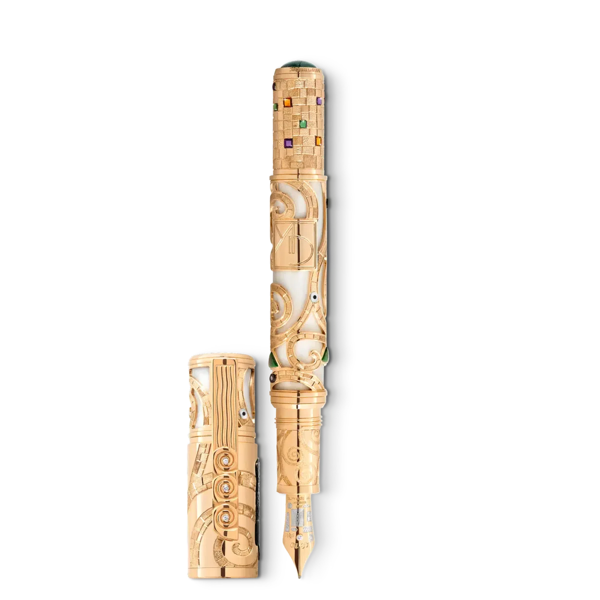 De-a lungul istoriei, marii artiști au exprimat experiența umană într-un limbaj universal al formei și frumuseții. Colecția Montblanc Masters of Art onorează contribuția lor eternă la căutarea perfecțiunii în artă – o căutare pe care Montblanc o celebrează și la care participă. Un artist a cărui viziune a contribuit la formarea Art Nouveau-ului vienez și a Epocii de Aur este Gustav Klimt. Ediția limitată Montblanc Masters of Art Homage to Gustav Klimt 8 celebrează realizarea supremă a operei sale târzii, Stoclet Frieze, inspirându-se din detaliile fascinante ale acestei capodopere în designul său. Prin rebeliunea sa împotriva conceptelor stereotipice din artă și societate, Gustav Klimt a fost un pionier al avangardei. El a fost determinat să experimenteze mijloace de expresie noi, neobișnuite. În urmărirea acestui obiectiv, el a fuzionat reprezentarea realistă, ornamentația și abstracția într-un stil care a culminat în mod strălucit cu friza în trei părți a Palais Stoclet. Spectaculosul mozaic auriu proiectat de Klimt pentru sala de mese lungă de 14 metri a acestei reședințe private este una dintre cele mai ambițioase opere de artă ale sale și cea căreia Limited Edition 8 îi aduce un omagiu. Pe capac și corp, un strat luminos de marmură albă pune în evidență decorul scheletic din aur masiv Au 750, format din triunghiuri, spirale și linii, înfrumusețat prin tehnici elaborate de gravare, precum și incrustări de sidef, onix negru și jad. Această ornamentație se inspiră din motivul Arborelui Vieții din friza Stoclet. Unul dintre cei trei șoimi negri Horus care populează ramurile copacului din friză este imortalizat pe capacul din aur galben solid Au 750, gravat manual cu onix negru și împodobit cu un rubin roșu. Zonele ornamentale, pline de culoare, din picturile lui Klimt sunt îmbătătoare, asemănându-se cu un covor decorativ care absoarbe totul, cu excepția fețelor și mâinilor personajelor. Klimt a dus proiectul său pentru friza Stoclet la Wiener Werkstätten pentru a fi adus la viață. Într-un proces elaborat, pietre de mozaic, sticlă, ceramică, aplicații din aur cioplit și plăci de email au fost încrustate în panouri de marmură de mari dimensiuni. Decorațiunea din aur galben solid Au 750 a ediției limitate 8, realizată folosind tehnici de bijuterie, trece la con într-un efect de mozaic realizat din aur galben solid Au 750 gravat manual, cu pietre prețioase tsavorite, ametist și citrin tăiate individual, într-un model împrumutat din ornamentația de bază a frizei Stoclet. Capătul conului este încrustat cu aventurină verde cromată, culoarea evocând primăvara, anotimpul noilor începuturi. Ca atare, aceasta a fost și culoarea aleasă pentru a simboliza Secesiunea la înființarea sa în aprilie 1897. În semn de recunoaștere a realizărilor lui Klimt pentru Secesiunea vieneză, incrustarea din aur galben solid Au 750 de pe cilindru poartă monograma Secesiunii cu inițialele GK. Clădirea care a găzduit Secesiunea din Viena a fost atât o manifestare arhitecturală a noului concept artistic, cât și un loc de expoziție pentru artiștii afiliați. La expoziția de deschidere din 1898, Gustav Klimt a prezentat pictura sa Pallas Athene, care oferă o imagine idealizată a Secesiunii în sine. Deoarece Athena este zeița războiului și a artelor, ea este descrisă lansând lupta pentru libertatea artistică. Clipul acoperit cu aur, special conceput pentru ediția limitată 8, este o altă referință la Pallas Athene a lui Klimt. Liniile ușor curbate care se termină în trei spirale corespund decorațiunii de pe rama metalică forjată a tabloului, pe care Klimt a comandat-o pentru zeița sa. Ornamentul spiralat, un motiv tipic întâlnit pe bijuteriile din aur miceniene, este o referință la patria greacă a Atenei. Ca o bijuterie, instrumentul de scris este împodobit cu un diamant tăiat în stil briliant pe fiecare dintre cele trei spirale ale clipului. Vârtejul este un element vizual la care Klimt a revenit în diverse lucrări, precum Stoclet Frieze, unde formează ramurile Arborelui Vieții. În ediția limitată 8, vârtejurile lui Klimt au inspirat gravura manuală pe partea frontală din aur galben solid Au 750. Penita din aur galben masiv 750, parțial acoperită cu rodiu, realizată manual, celebrează modelele geometrice tipice întâlnite în toate lucrările lui Gustav Klimt, prin gravura fină încrustată cu un diamant tăiat în stil briliant. Penita poartă, de asemenea, numărul 4810, o referință la înălțimea celui mai înalt munte din Europa de Vest, Mont Blanc, care întruchipează aspirațiile înalte ale fondatorilor Montblanc. La fel ca Gustav Klimt, cei trei fondatori ai Montblanc au fost pionieri pasionați, ale căror viziuni continuă să modeleze brandul și astăzi.