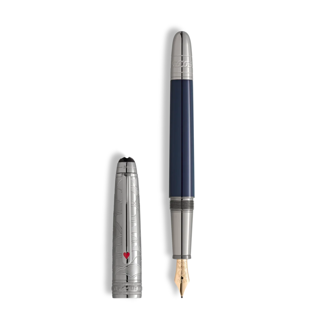 Colecția Meisterstück Around the World in 80 Days se inspiră din renumitul roman de aventuri al lui Jules Verne. Stiloul Solitaire Doué Classique, decorat cu lac prețios albastru închis lustruit și capac metalic, povestește călătoria epică a domnului Fogg și a lui Passepartout. Porniți în ultima etapă a călătoriei, de la Yokohama înapoi la Londra, via Statele Unite, cei doi traversează vastul continent american cu trenul. Descoperă detaliile complexe – un tren gravat elegant cu laser pe capac, un model de lanț de siguranță pe con, care reflectă momentul crucial în care Passepartout detașează trenul de locomotivă pentru a salva echipajul atacat de Sioux.Designul șepcii surprinde supapele de presiune și fumul care se ridică din locomotivă, în timp ce clema are un simbol roșu lăcuit în formă de inimă, simbolizând uniunea dintre Phileas Fogg și prințesa Aouda. În plus, simbolurile reprezintă pariul îndrăzneț al lui Fogg de a finaliza călătoria în doar 80 de zile. Partea superioară a capacului poartă gravată cronologia călătoriei – 36 de zile de la Yokohama la Londra, culminând cu un total de 80 de zile în jurul lumii.Acest instrument de scris este înnobilat de un peniț din aur de 18K realizat manual, marcat cu 14/11 și 21/12 – o amintire a plecării domnului Fogg din Yokohama pe 14 noiembrie și a planului său ambițios de a se întoarce la clubul din Londra până pe 21 decembrie pentru a câștiga pariul. De asemenea, este decorat cu o reprezentare a unui balon cu aer cald, referință la primul roman de aventuri al lui Jules Verne.