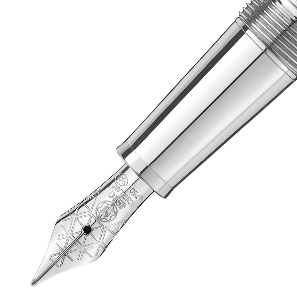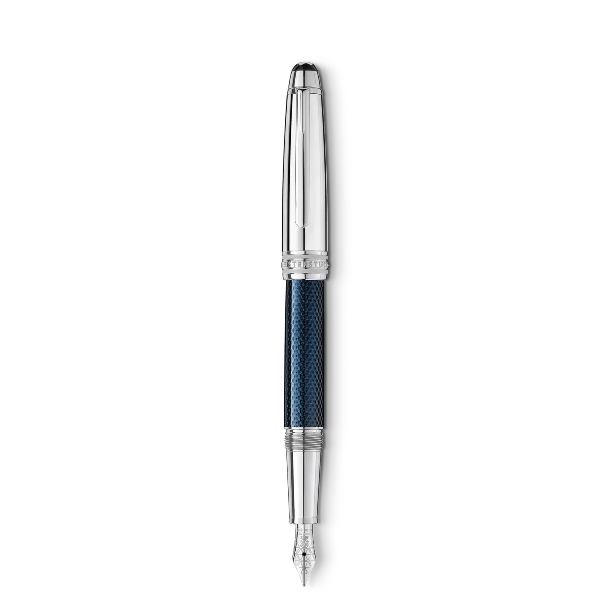 Meisterstück Solitaire Doué Blue Hour Classique se prezintă ca un produs Solitaire prețios, lăcuit în albastru, cu accesorii placate cu platină. Ora magică dintre lumina zilei și noapte – Blue Hour – creează un contrast armonios și o atmosferă uluitoare, care a servit ca inspirație pentru design. Modelul hexagonal de pe penița artizanală din aur Au750 acoperită cu rodiu, precum și de pe corp, reflectă refracția luminilor și a traficului nocturn din orașele urbane.