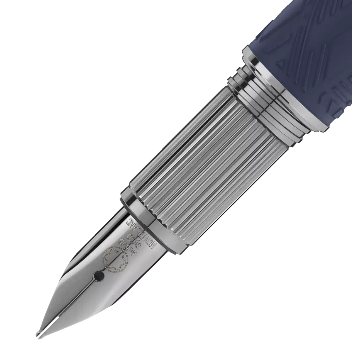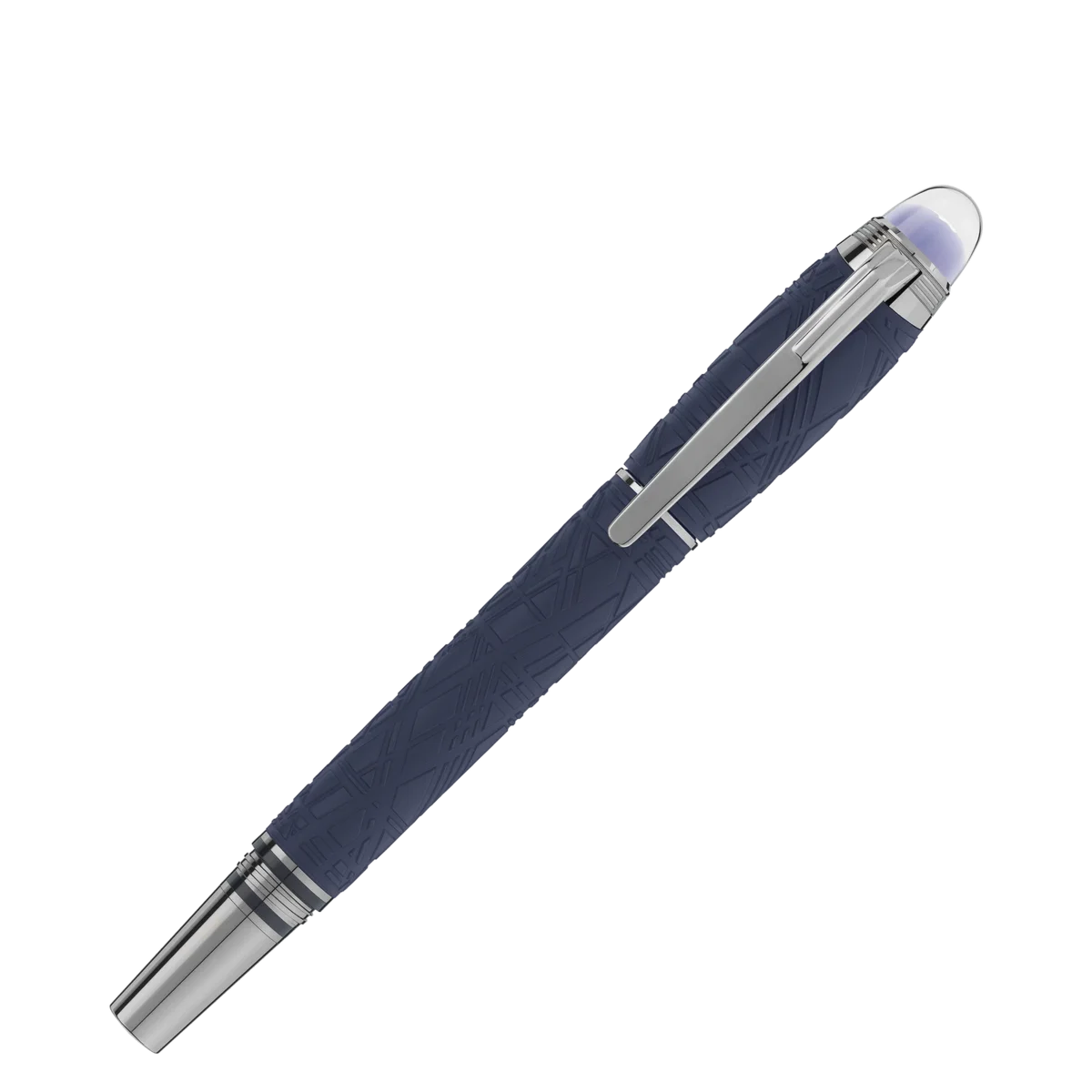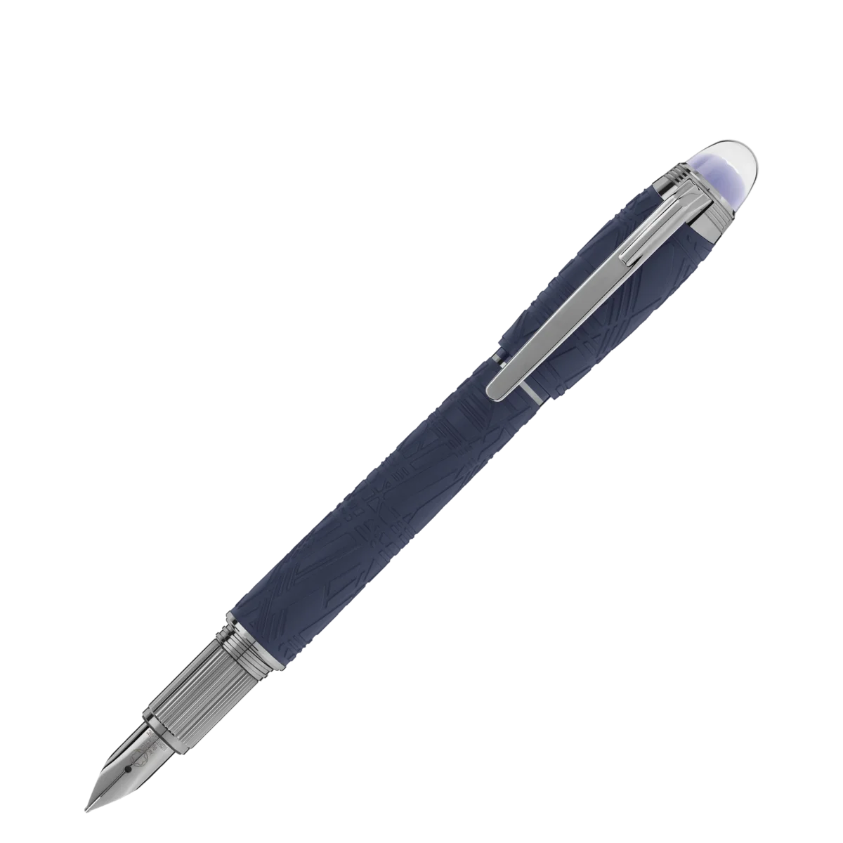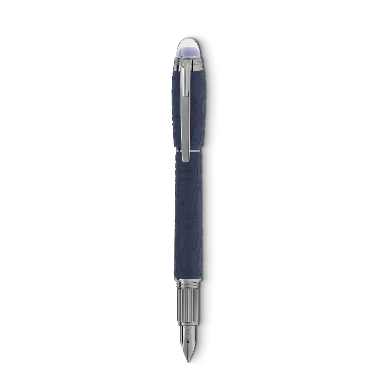 StarWalker SpaceBlue privește dincolo de planeta Pământ și se îndreaptă spre stele și galaxie. Noua colecție StarWalker aduce un aspect nou capacului și corpului din rășină, cu un design care amintește de structurile complexe ale modelului Widmanstätten, una dintre cele mai hipnotice creații ale naturii. Toate părțile metalice sunt acoperite cu ruteniu închis la culoare, însoțit de o nuanță albastră intensă a spațiului cosmic pentru rășina prețioasă mată, care amintește de nuanțele unui cer înstelat. În plus, subdomenul de pe vârful capacului, peste care plutește emblema Montblanc, are o culoare albastră intensă a spațiului cosmic. Stiloul este realizat manual, cu un peniț din aur Au 585 acoperit cu ruteniu.