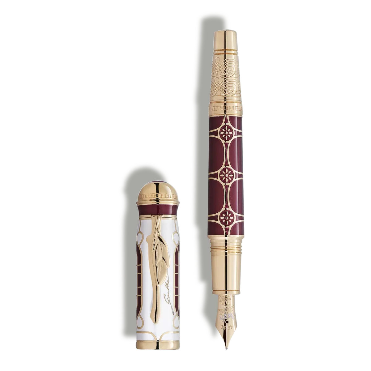 În centrul renașterii intelectuale din secolul al XVIII-lea s-a aflat un om în particular, ale cărui scrieri au rezistat testului timpului: Johann Wolfgang von Goethe. Polimat, gigant al literaturii germane, avocat, ministru, regizor de teatru, precum și colecționar și naturalist prodigios, el a fost în toate privințele un revoluționar, hotărât să depășească limitele percepției și învățării. Condus de o sete insațiabilă de cunoaștere, versatilitatea sa creativă nu cunoștea limite. Profunzimea filosofică a lui Faust, subtilitatea lirică a poeziei sale și amploarea explorării științifice din spatele teoriei sale despre culori și tratatelor sale botanice au avut o semnificație epocală și atestă, prin varietatea și influența lor de anvergură, geniul lui Goethe. Ca poet și om de stat, consilier, prieten și iubit, el a lăsat o amprentă de neșters asupra lumii din jurul său și servește până în prezent ca sursă de inspirație și viziune. Cu sprijinul Klassik Stiftung Weimar și al Muzeului Național Goethe pe care îl găzduiește, Montblanc dedică ediția limitată Writers Edition Homage to Johann Wolfgang von Goethe 1808 acestui geniu universal, concentrându-se în special pe rolul său de om de stat. Goethe și-a marcat epoca prin cuvinte și fapte. Cea mai mare ediție a operelor și scrierilor sale complete cuprinde în prezent 40 de volume, conținând aproximativ 3000 de poezii. Piesa sa de teatru Götz von Berlichingen a fost publicată anonim în 1773, dar doar un an mai târziu, Suferințele tânărului Werther, scrisă în mai puțin de patru săptămâni, l-a catapultat pe avocatul de 25 de ani la faimă peste noapte. Reputația sa nu a trecut neobservată la Weimar, unde tânărul duce, Karl August, era dornic să-și transforme ducatul într-o „Curte a Muzelor”. Mutarea lui Goethe la Weimar a marcat un punct de cotitură în viața sa. Aici, el nu mai era văzut doar ca un poet și filosof renumit, ci și ca un om de stat și reformator, reactivând tradiția mineritului de argint, reorganizând politica economică și fiscală și ajungând rapid să devină consilierul principal al ducelui. Goethe a fost înnobilat în 1782 în semn de recunoaștere a serviciilor sale aduse curții din Weimar, iar în 1816 a fost distins cu Ordinul Șoimului Alb, cunoscut și sub numele de Ordinul Casei Vigilente. Această insignă în formă de stea a fost sursa de inspirație pentru ornamentul placat cu aur de pe corpul ediției limitate. Lacul roșu carmin de dedesubt face referire la culoarea eșarfei ceremoniale purtate de Goethe în portretul realizat de Gerhard von Kügelgen. Modelul auriu trasat în jurul capacului seamănă cu arcadele rotunjite care apar în mod proeminent într-o gravură a lui Rembrandt adaptată pentru frontispiciul „Fragmentului Faust” al lui Goethe din 1790. Figura lui Faust l-a ocupat pe Goethe aproape toată viața. El a scris o versiune timpurie, Urfaust, apoi un Fragment și, în final, celebra sa dramă Faust I, publicată în 1808. De o elocvență și o importanță globală de neegalat, această dramă este o adevărată capodoperă a literaturii mondiale. Goethe însuși a inventat termenul „literatură mondială”, folosindu-l pentru a semnifica o expresie a universalității, care transcende toate barierele lingvistice, etnice și temporale. Ca simbol al conceptului lui Goethe de „literatură universală”, capacul are forma unui glob, încununat de emblema Montblanc. Forma ușor curbată a capacului, care seamănă cu un borcan de sticlă istoric de chimist, este un omagiu adus realizărilor lui Goethe ca om de știință și colecționar. Clipul în formă de frunză și semnătura gravată onorează studiile sale extraordinare în domeniul morfologiei și, în special, propunerea sa privind o formă arhetipală a plantelor. El a transpus această idee chiar și în versuri, în poemul său didactic de dragoste Metamorfoza plantelor. Aceasta și toate celelalte meditații și descoperiri ale sale au fost consemnate pe hârtie folosind instrumente de scris prețioase, care au inspirat aspectul istoric al întregii ediții Writers Edition. Spre deosebire de Goethe însuși, ale cărui studii au servit la aprofundarea cercetării științifice, omologul său fictiv era chinuit de îndoieli. Faust, nereușind să-și atingă propriile obiective academice, se îndreaptă în schimb către magie, invocând „Spiritul Pământului”. Scena dramatică în care lumina radiată de această prezență copleșitoare umple camera a fost surprinsă într-una dintre schițele lui Goethe, modelul pentru gravura de pe vârful conului. În timp ce alte gravuri din jurul conului sunt împrumutate din ornamentele de pe certificatul său de numire în funcția de consilier al Legației Privată din Weimar, penița solidă din aur Au 750 este împodobită cu una dintre scenele principale din Faust: Mefisto, zburând deasupra orașului nocturn, ca în ilustrația originală a lui Eugène Delacroix. Literele și data de deasupra acesteia amintesc de data publicării Faustului la Leipzig. Un fragment din 1790. Ca un omagiu adus anului publicării Faust I, o piatră de hotar în teatrul german și una dintre cele mai traduse și jucate piese de teatru din lume, ediția limitată cuprinde doar 1808 de piese.
