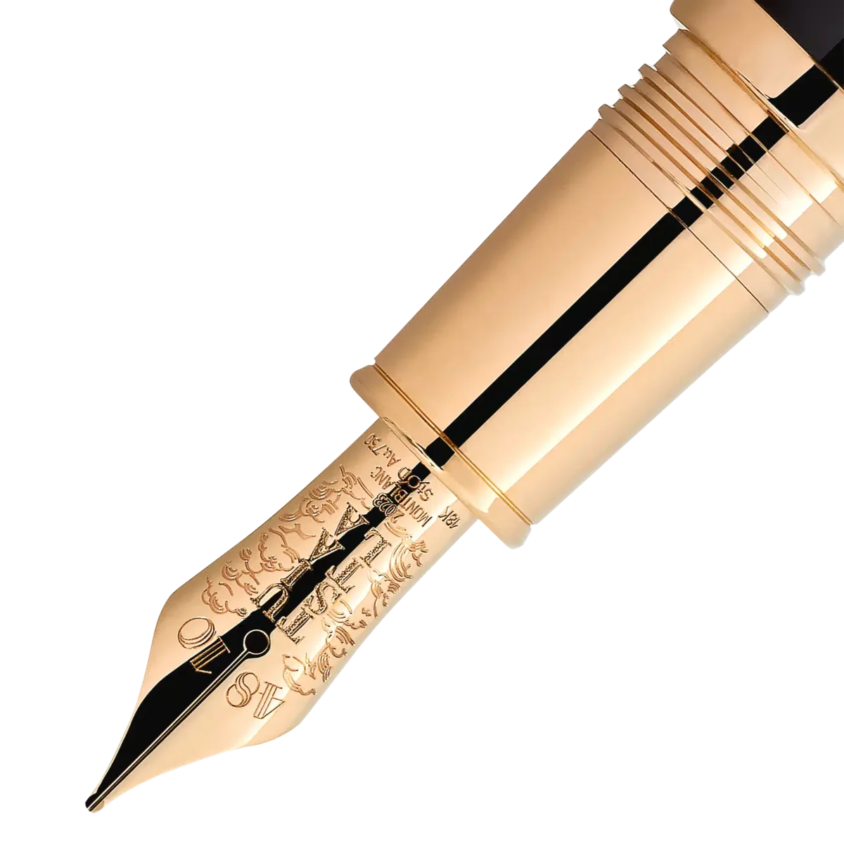 Robert Louis Stevenson, născut în Edinburgh, Scoția, în 1850, avea două mari dorințe: libertatea și posibilitatea de a se cufunda în alte lumi. A scris eseuri și relatări de călătorie, precum și povești de aventură legendare, populate de personaje remarcabile, ale căror nume provoacă fiori cititorilor din întreaga lume: Long John Silver, Căpitanul Flint, Jekyll și Hyde. Ediția Montblanc Writers Edition Homage to Robert Louis Stevenson este dedicată acestui povestitor plin de imaginație. Romanul „Insula comorilor” a inspirat multe detalii de design ale ediției. Forma generală a instrumentului de scris și inelele de pe con se combină pentru a crea impresia unui binoclu istoric, extensibil. Relatând povestea „Insulei comorilor”, această ediție prezintă faimoasa Hispaniola pe corp, încrustată în lac negru prețios. Pornind într-o călătorie, Hispaniola flutură un steag britanic ținut în spatele unei mici ferestre. Urmând povestea revoltei piraților, steagul poate fi rotit cu ajutorul unui mic buton pentru a dezvălui steagul piraților. Liniile verticale care amintesc de scândurile goeletei „Hispaniola” și de un cufăr tradițional de mare împodobesc capacul acoperit cu aur. În spatele agrafei aurite, liniile converg într-o roză a vânturilor, în timp ce agrafa imită forma unui bolț de fixare, la care ar fi fixate frânghiile unei nave. Capacul este încununat de emblema Montblanc din sidef. Inelul capacului este decorat cu o gravură a semnăturii lui Stevenson. Ca referință la pasiunea lui Robert Louis Stevenson pentru navigarea pe mare și stabilirea sa în Mările Sudului, penița din aur masiv Au 750 realizată manual este gravată cu nori, pescăruși și titlul dat de samoani marelui scriitor și călător mondial, „Tusitala”.Cu aurul semnătură și/sau acoperirea cu aur semnătură, Montblanc descrie nuanța luminoasă a aurului galben, care a devenit o tonalitate apreciată pentru instrumentele de scris ale Maison.