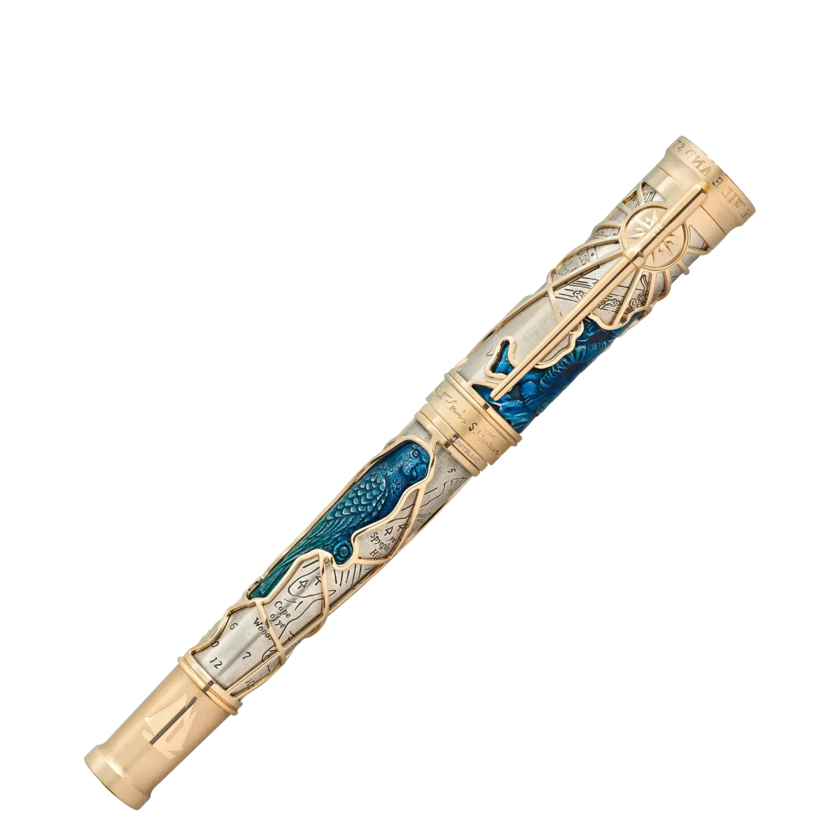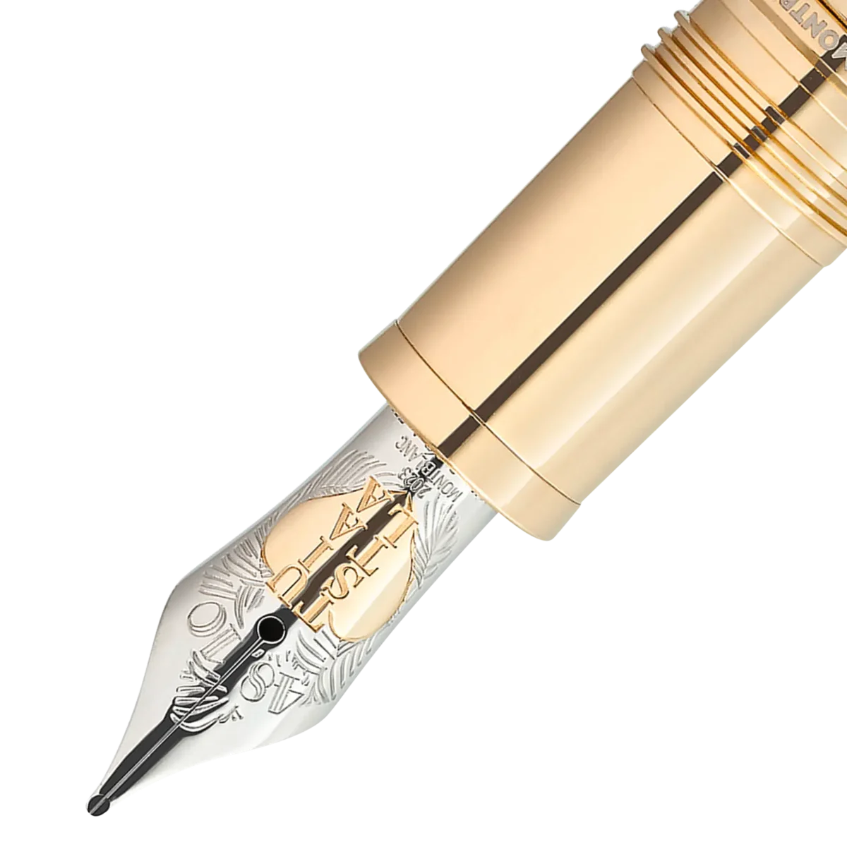 Robert Louis Stevenson, născut în Edinburgh, Scoția, în 1850, avea două mari dorințe: libertatea și imersiunea în alte lumi. A compus eseuri și relatări de călătorie, precum și poveștile sale legendare de aventură, populate cu personaje remarcabile, ale căror nume provoacă fiori cititorilor din întreaga lume: Long John Silver, Căpitanul Flint, Jekyll și Hyde. Ediția Montblanc Writers Edition Homage to Robert Louis Stevenson este dedicată acestui povestitor plin de imaginație. Romanul „Insula comorilor” a inspirat multe detalii de design ale ediției. Forma generală a instrumentului de scris și inelele de pe con dau impresia unui binoclu istoric, extensibil. Una dintre cele mai periculoase figuri de la bordul navei Hispaniola este Long John Silver, care este imortalizat pe capac ca o figură gravată manual și umplută cu lac. Papagalul fidel al lui Long John Silver, căpitanul Flint, este, de asemenea, încorporat în grilă ca o figură gravată manual și acoperită cu lac degradat. În jurul inelului superior al capacului se află prima linie din requiemul pe care Stevenson l-a scris pentru sine: „UNDER THE WIDE AND STARRY SKY” (Sub cerul larg și înstelat). Literele sunt inversate oglindă și amintesc de tema dualității din romanul lui Stevenson „The Strange Case of Dr Jekyll and Mr Hyde” (Ciudatul caz al doctorului Jekyll și al domnului Hyde). Clipul acoperit cu aur galben imită forma unui cui de fixare la care este atașat echipamentul pe o navă precum Hispaniola. În spatele clipului, precum și pe corpul acestei ediții, o roză a vânturilor stilizată este lucrată în grila solidă din aur galben Au 750. Harta comorii desenată de mână de Stevenson, care este punctul de plecare și centrul întregului roman, este gravată pe corpul din argint sterling Ag 925. Penița este formată din două elemente: cuvântul „Tusitala” – un nume dat lui Stevenson de samoani, care se traduce prin „povestitor” – și frunze de palmier care reprezintă sosirea lui Stevenson în Samoa, insula sa iubită din Pacific.