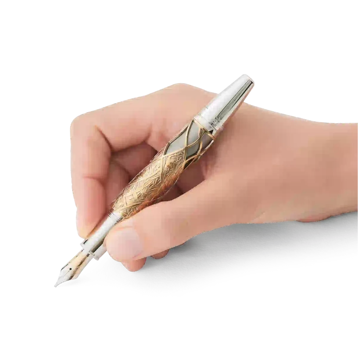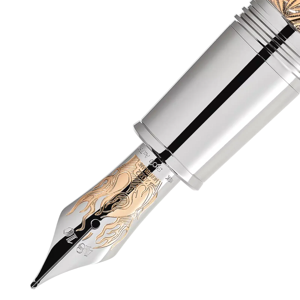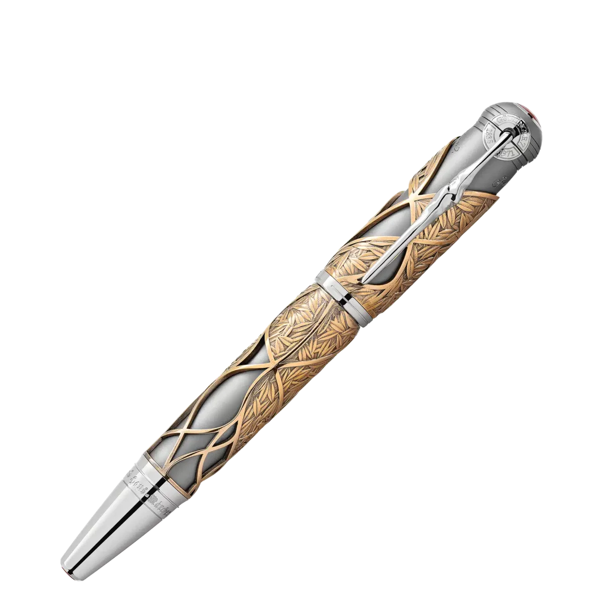 „A fost odată ca niciodată…” Montblanc Writers Edition Homage to the Brothers Grimm este dedicat lui Jacob și Wilhelm Grimm și celebrează opera lor în domeniul basmelor germane și europene, printre care se numără unele dintre cele mai faimoase basme, precum „Albă ca Zăpada”, „Cenușăreasa” și „Frumoasa din pădurea adormită”. Silueta generală a instrumentului de scris are forma unui baston vechi de drumeție. Realizată din metal cu un strat special vintage, această ediție se inspiră din povestea „Frumoasa din pădurea adormită”, ilustrată de frunzele și spinii împletite în jurul capacului și corpului stiloului. Capacul este încoronat de emblema Montblanc din sidef prețios. Clipul acoperit cu platină, care amintește de o bucată de lemn noduros, dezvăluie în mod surprinzător silueta profilului fraților Grimm atunci când este rotit. Ca un omagiu adus magiei povestirii, penița artizanală din aur bicolor Au 750 cu acoperire de rodiu poartă flăcările unui foc, care era adesea locul în care se transmiteau poveștile populare.
