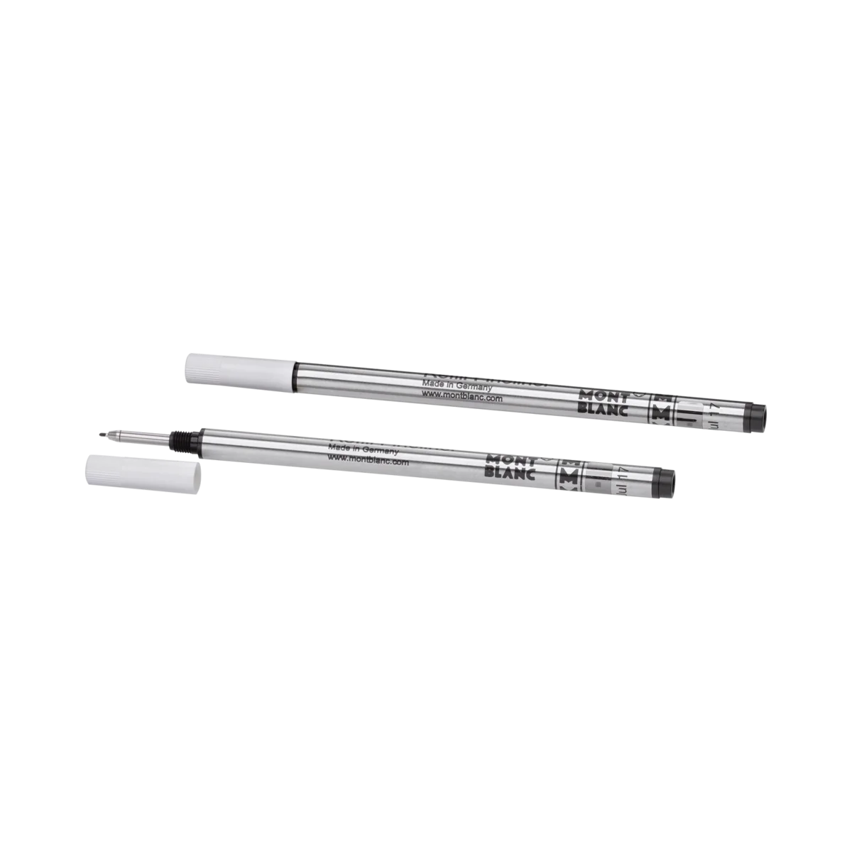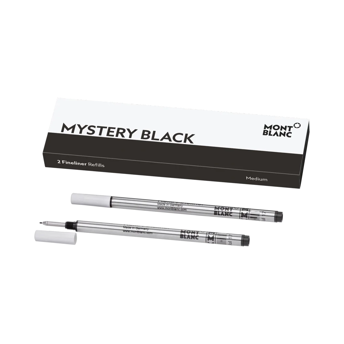 Rezerve pentru stilouri cu vârf fin Montblanc, Mystery Black. Potrivite pentru toate stilourile cu vârf fin/roller Montblanc, cu excepția stilourilor Meisterstück LeGrand, Montblanc M și a stilourilor roller fără capac din colecția Heritage. Unități de ambalare = 2 rezerve. M = mediu