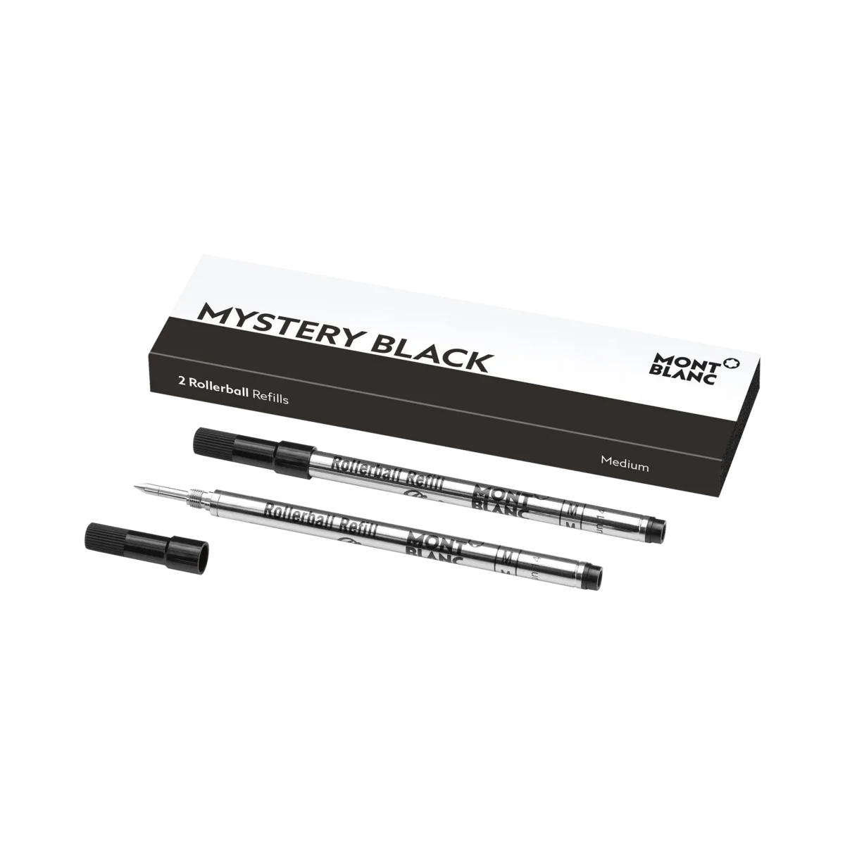Rezerve pentru rollerball Montblanc, Mystery Black. Potrivite pentru toate stilourile rollerball/fineliner Montblanc, cu excepția stilourilor rollerball fără capac din colecțiile Meisterstück LeGrand, Montblanc M și Heritage. Unități de ambalare = 2 rezerve. M = mediu